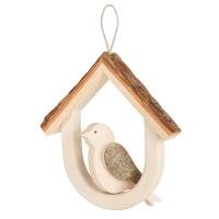 小鳥とお家のモビールです。屋根のてっぺんに紐がついているので、お好きな空間に飾ってお楽しみいただけます。まるで森の小鳥のさえずりが聞こえてくるようですね。小鳥とお家は取り外しができ、体の向きもかえることができます。
