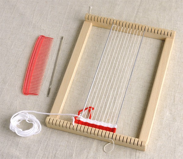 針で縫うように織ります。従来のひを使ったり、手で直接織っていくのと違って、細かい細工ができます。絵を描くように自由な柄を作ることも出来ますので、お楽しみ下さい。