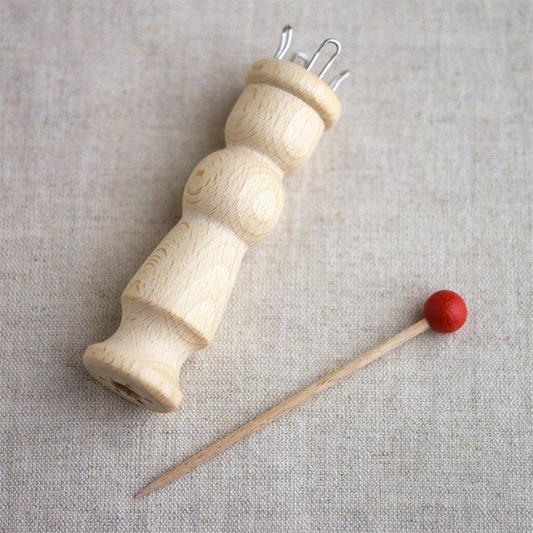 シンプルな白木のリリアン編みです。編み始めると、夢中になってしまいます。どんどん編んで長い編み紐ができると、それでバッグや鍋敷き等が作れます。また中に細いゴムを通すと髪結びのゴムができますね。編み棒を、針の間に差し込んでおけば、編みかけの糸が外れる心配もありません。