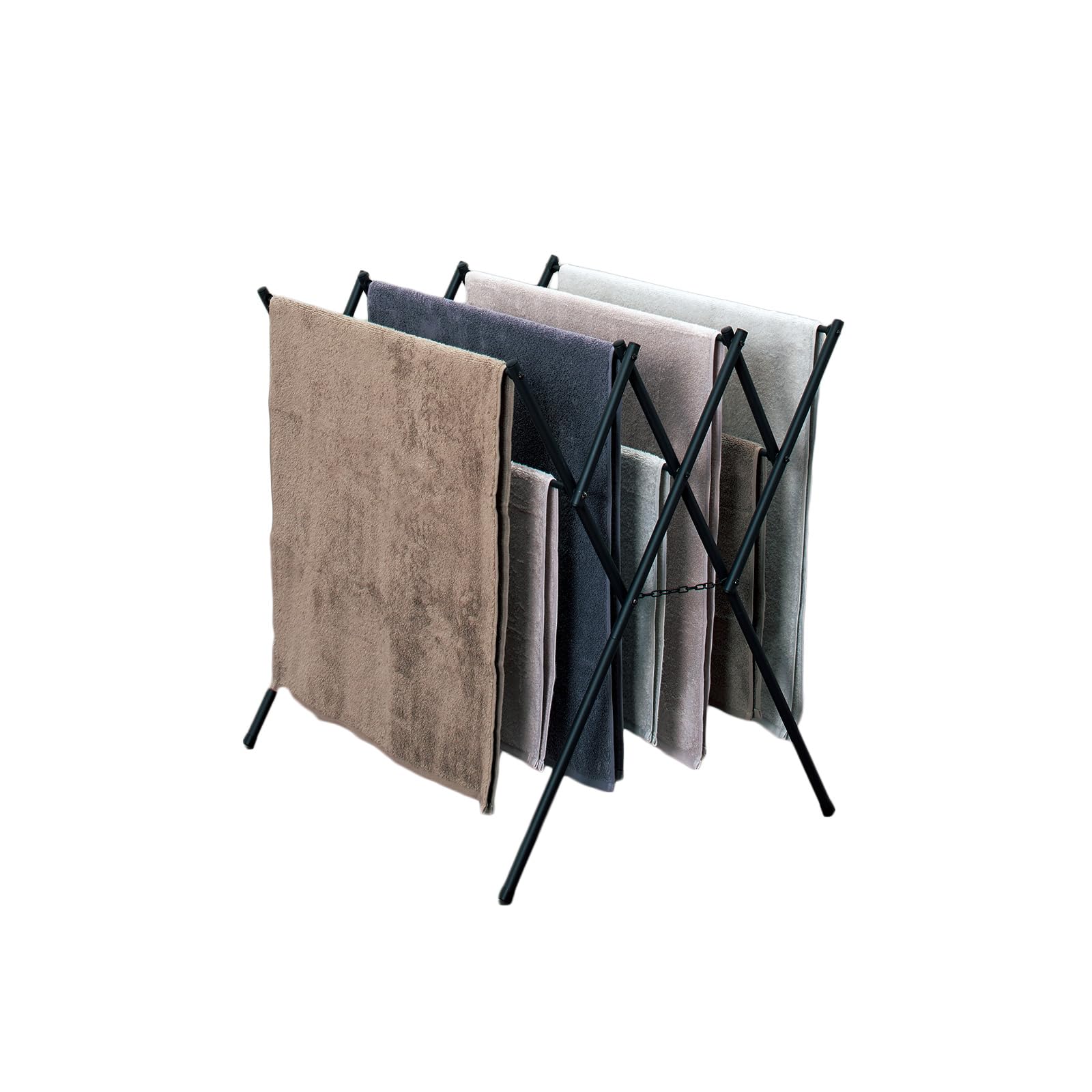 どんなインテリアにも馴染みやすいシックなデザインの物干し【用途】タオルハンガー【特徴】・バスタオルが4枚、フェイスタオルが3枚干せる・バーの高さを段違いにすることで通気性がUPし、乾かす時間を早め時短にもつながる・製品を手に取ってパッと広げるだけですぐに使用できる・非常にコンパクトに折りたためるので、ちょっとしたすき間に収納出来る【注意事項】※お客様組立品です(工具不要)。※室内専用です。