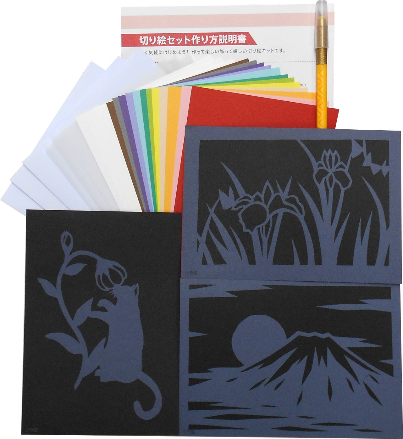 セット内容:切り絵下絵(ポストカードサイズ)3種類、デザインナイフ、カッターマット(A5サイズ)、色紙12枚、トレーシングペーパー3枚、台紙3枚、封筒3枚、作り方説明書