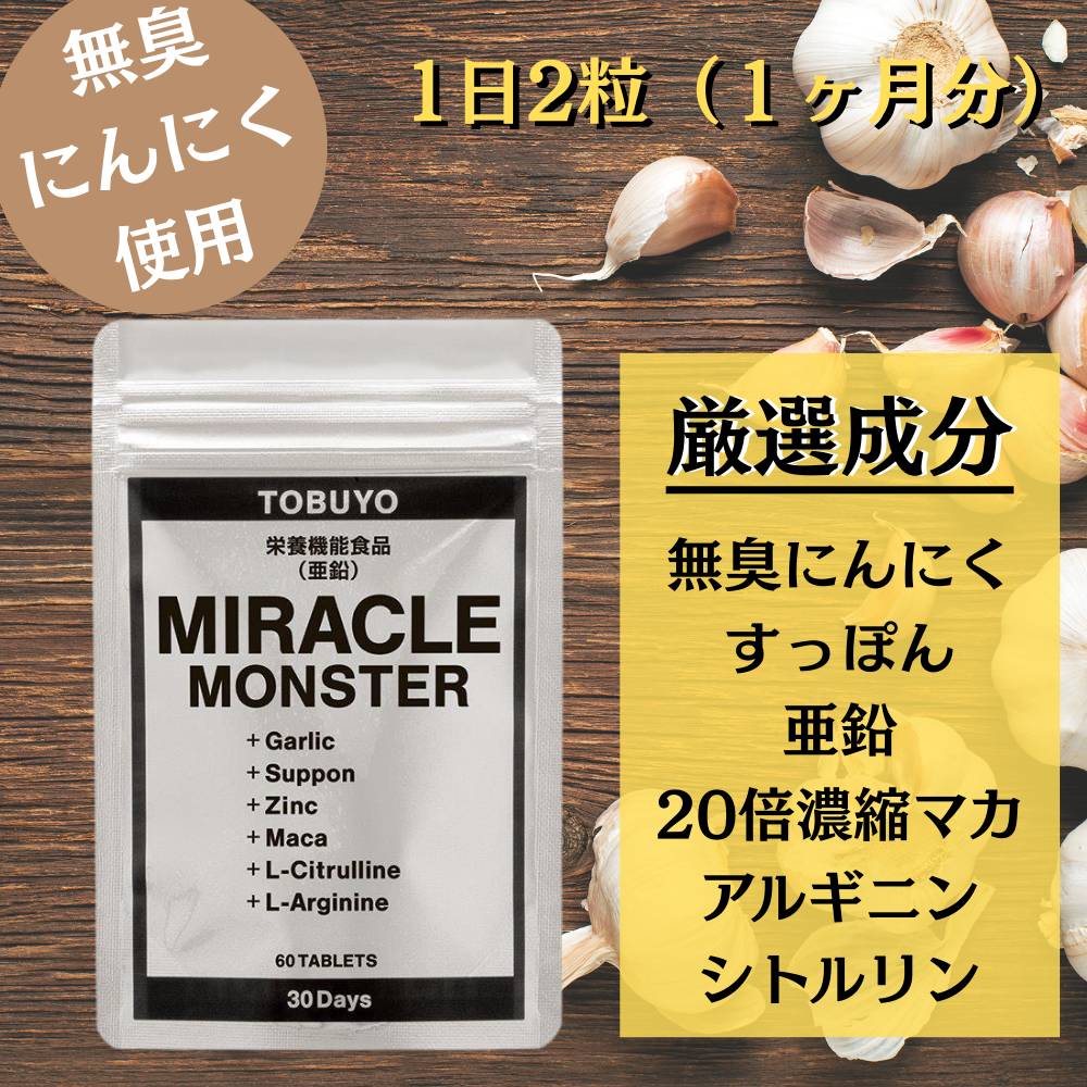 ●商品名・内容量MIRACLE MONSTER(ミラクルモンスター)60粒(1ヶ月分)●原材料名無臭にんにく末(国内製造)、L-シトルリン、すっぽんエキス末、マカエキス末/結晶セルロース、HPMC、グルコン酸亜鉛、Lーアルギニン、ステアリン酸カルシウム、微粒二酸化ケイ素●お召し上がり方1日に2粒を目安に、水またはお湯とともにお召し上がりください。●ご使用上の注意・亜鉛は、味覚を正常に保つのに必要であるとともに、たんぱく質・核酸の代謝に関与して、健康の維持に役立つ栄養素です。 また皮膚や粘膜の健康維持を助ける栄養素です。・本品1日2粒(摂取目安量)をお飲みいただくと、1日当たりの亜鉛の栄養素等表示基準値(2025)(18歳以上、基準熱量2,200kcal)8.5mgの165%が摂取できます。・本品は、多量摂取により疾病が治療したり、より健康が増進するものではありません。・亜鉛の摂りすぎは、銅の吸収を阻害するおそれがありますので、過剰摂取にならないよう注意してください。 1日の摂取目安量を守ってください。・乳幼児・小児は本品の摂取を避けてください。・本品は、特定保健用食品と異なり消費者庁長官による個別審査を受けたものではありません。●1日(2粒)あたりの主要原料含有量無臭にんにく末…102mg、すっぽんエキス末…20mg、マカエキス末(20倍濃縮)…20mg、Lーシトルリン…100mg、Lーアルギニン…100mg●栄養成分表示(2粒)当たりエネルギー…3.16kcalたんぱく質…0.40g脂質…0.03g炭水化物…0.33g食塩相当量…0.002g亜鉛…14.0mg●形状 ハードカプセル●賞味期限 別途商品ラベルに記載●販売者 株式会社 桜 ●生産国 日本●広告文責 株式会社 桜