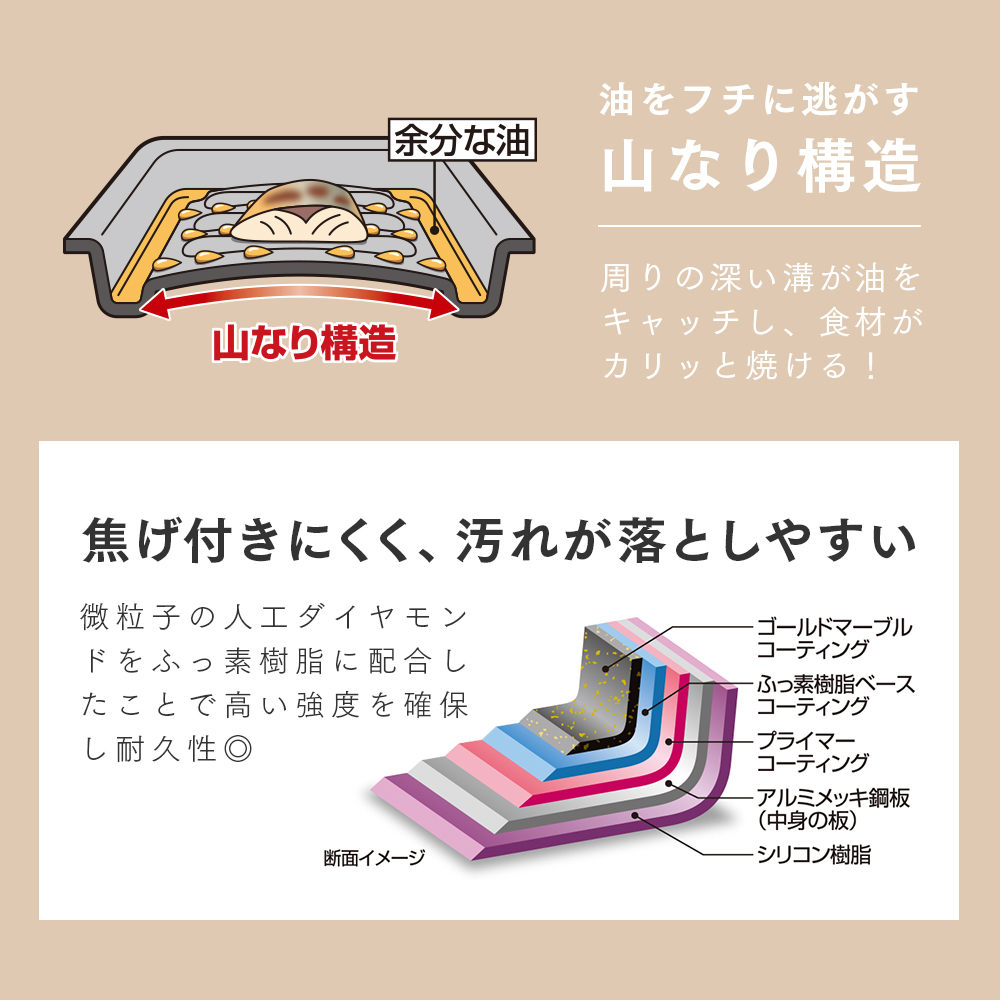 油が下に落ちないお手入れ簡単IH対応グリル専用焼き魚トレー。山なり構造で食材の油をフチへ逃がして、魚のベタツキを防ぎカラッと焼き上げます。マーブルコートでこびりつきにくく汚れを落としやすく面倒なグリルの後片づけがラクラク!