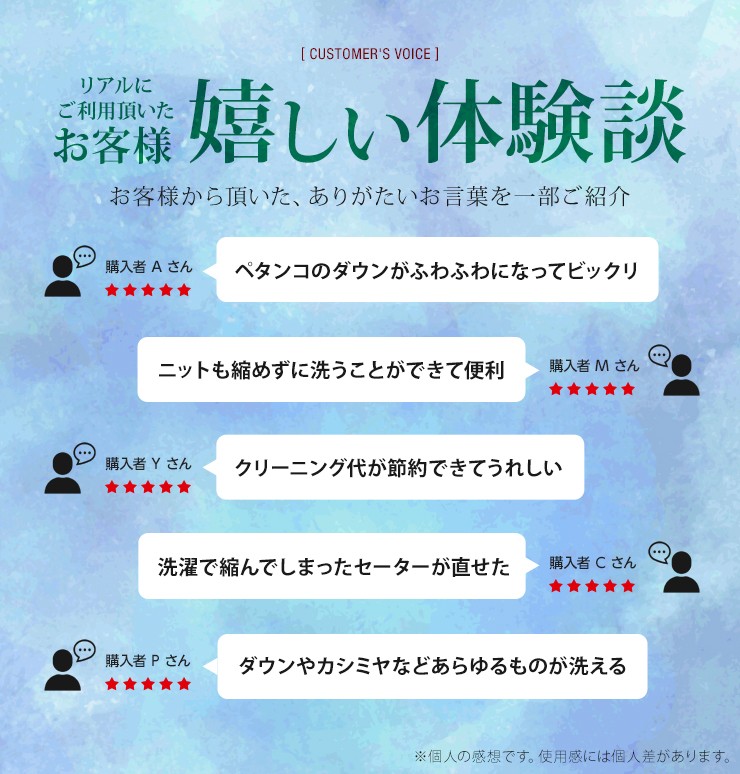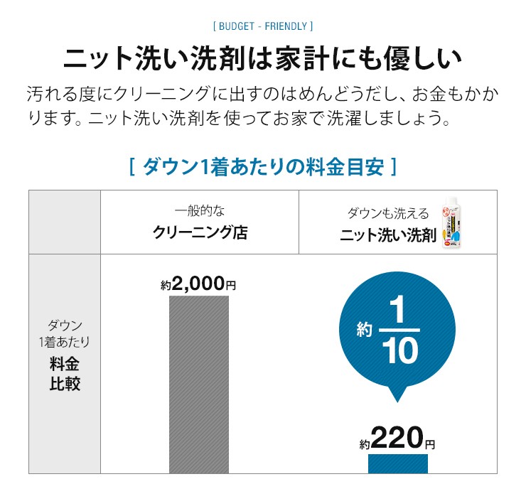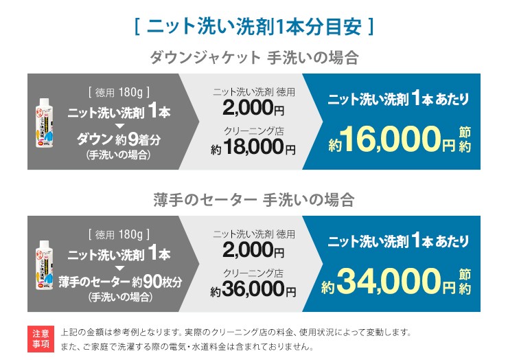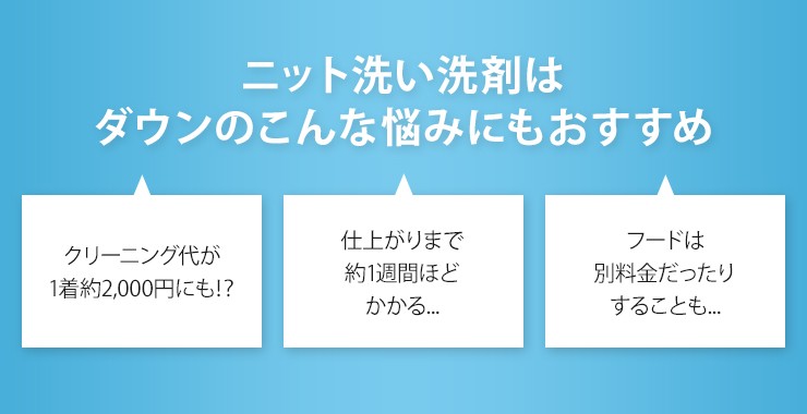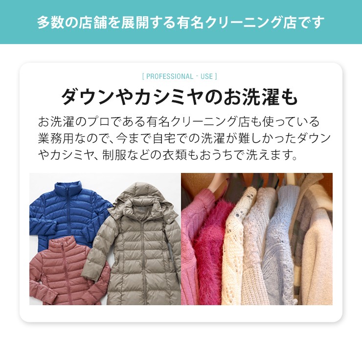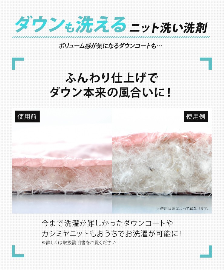 おうちでダウンやニットのお洗濯ができるので、クリーニング代の節約に。クリーニング業界で実際に使われているニット洗い洗剤。一度縮んでしまったニットなどの衣類を補修します!(※衣類の状態によりことなります)ボリューム感が気になるダウンコートも、ふんわり仕上げでダウン本来の風合いに。手洗いだけでなく、洗濯機のドライコースでも洗えます。