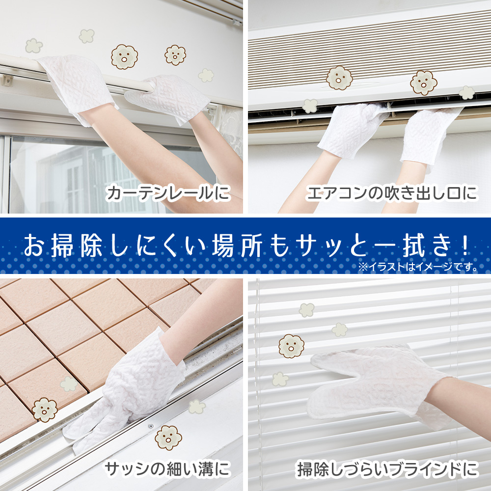 お掃除しにくい場所も素手感覚でラクにお掃除。左右兼用で両面使える、使い捨てタイプのお掃除手袋です。親指、人差し指、中指が分かれているので細かい隙間も拭きやすい!凹凸形状でホコリをしっかりキャッチします。エアコンの吹き出し口、カーテンレール、ブラインド、サッシの溝などのお掃除に。