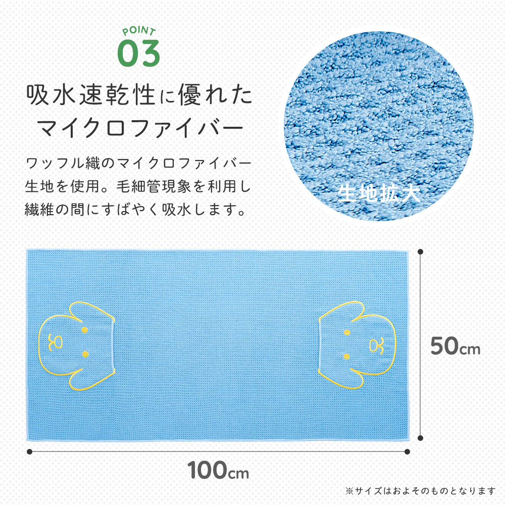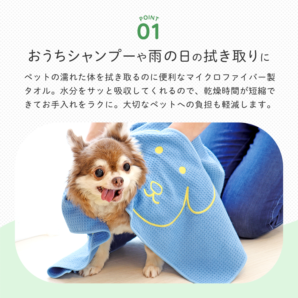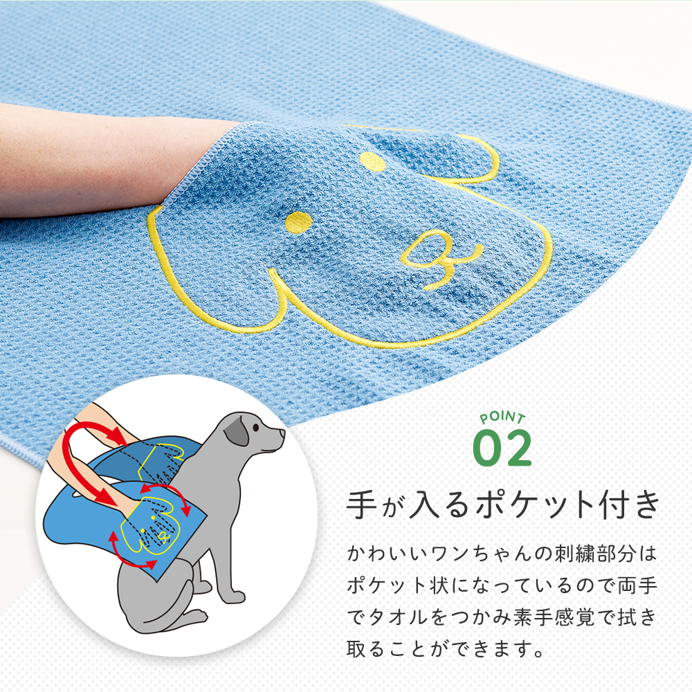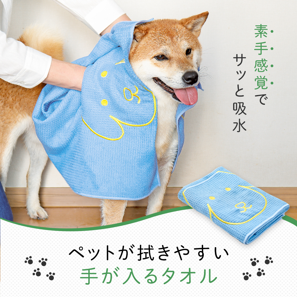 ペットの濡れた体を素手感覚でサッと吸水!ペットのおうちシャンプーや雨の日の拭き取りに便利です。吸水速乾性のあるワッフル織のマイクロファイバー生地だから、乾燥時間の短縮でペットも人もラクラク!手が入るポケット付。