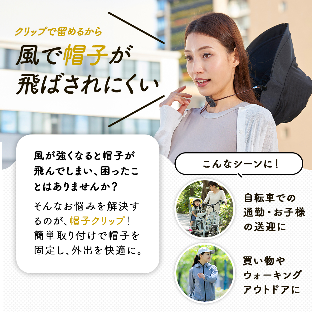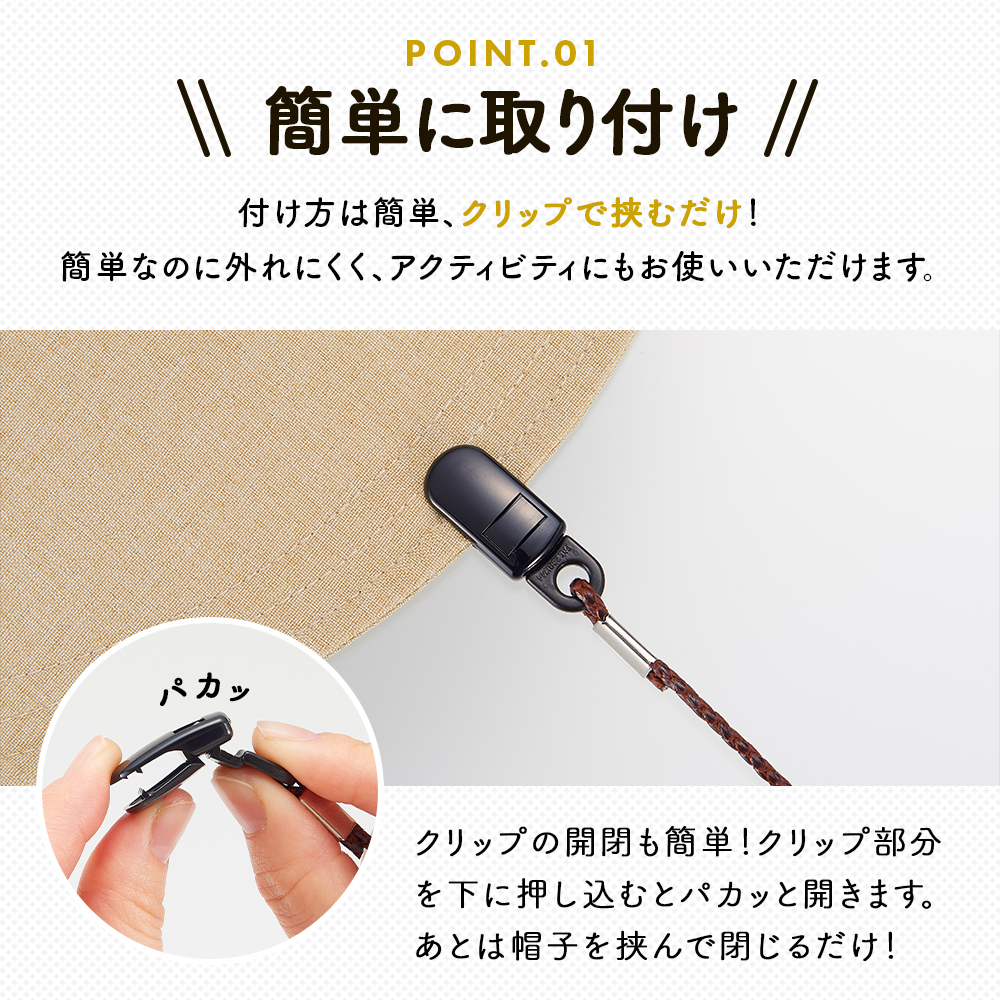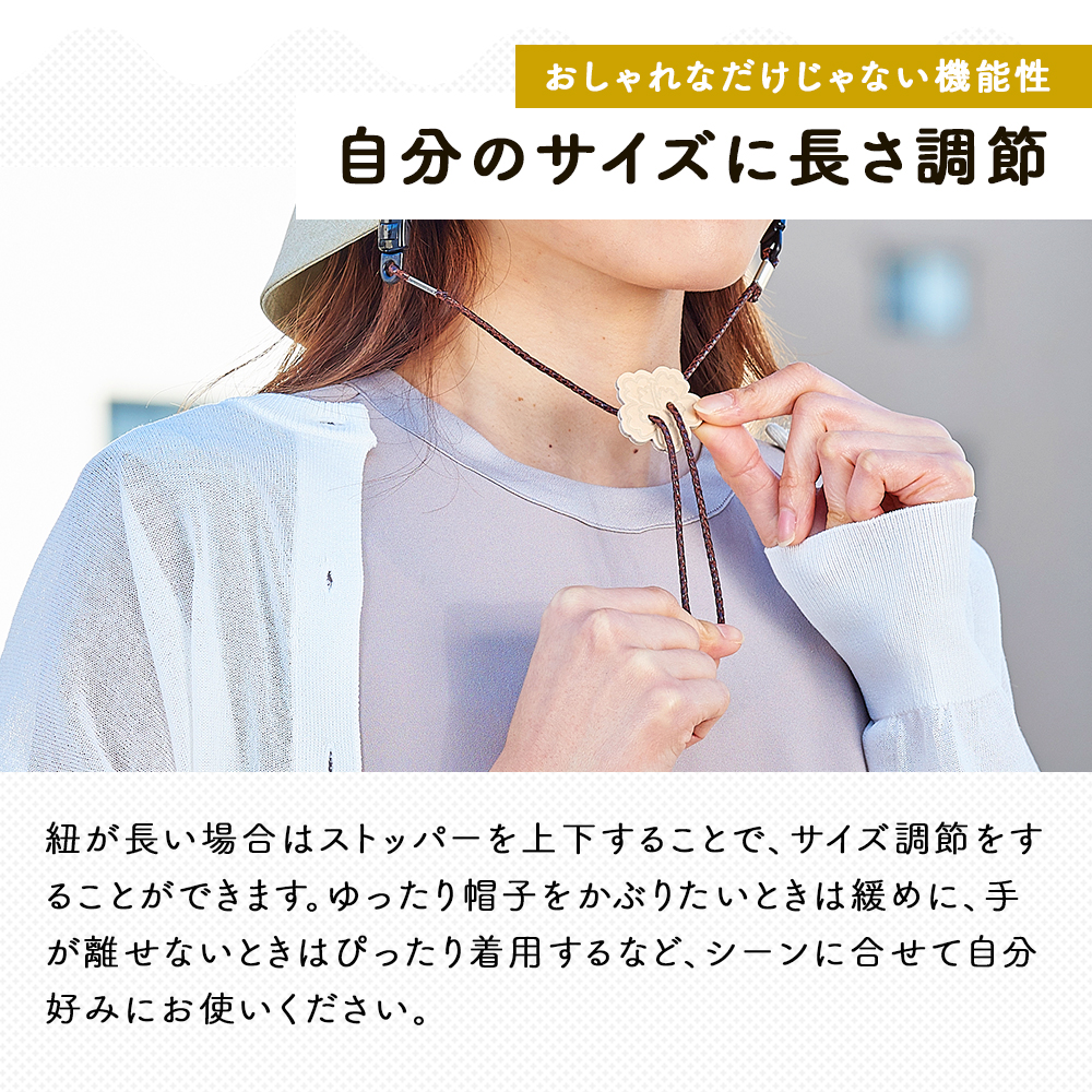 クリップで挟むだけの簡単取付!外れにくいクリップで、風で帽子が飛ぶのを防いでくれる帽子ストッパーです。かわいいチャームのストッパーでサイズ調節が可能。帽子のツバやビンカワにあご紐のように取り付けたり、帽子のツバと洋服に取り付けたりと、使い方もいろいろ!