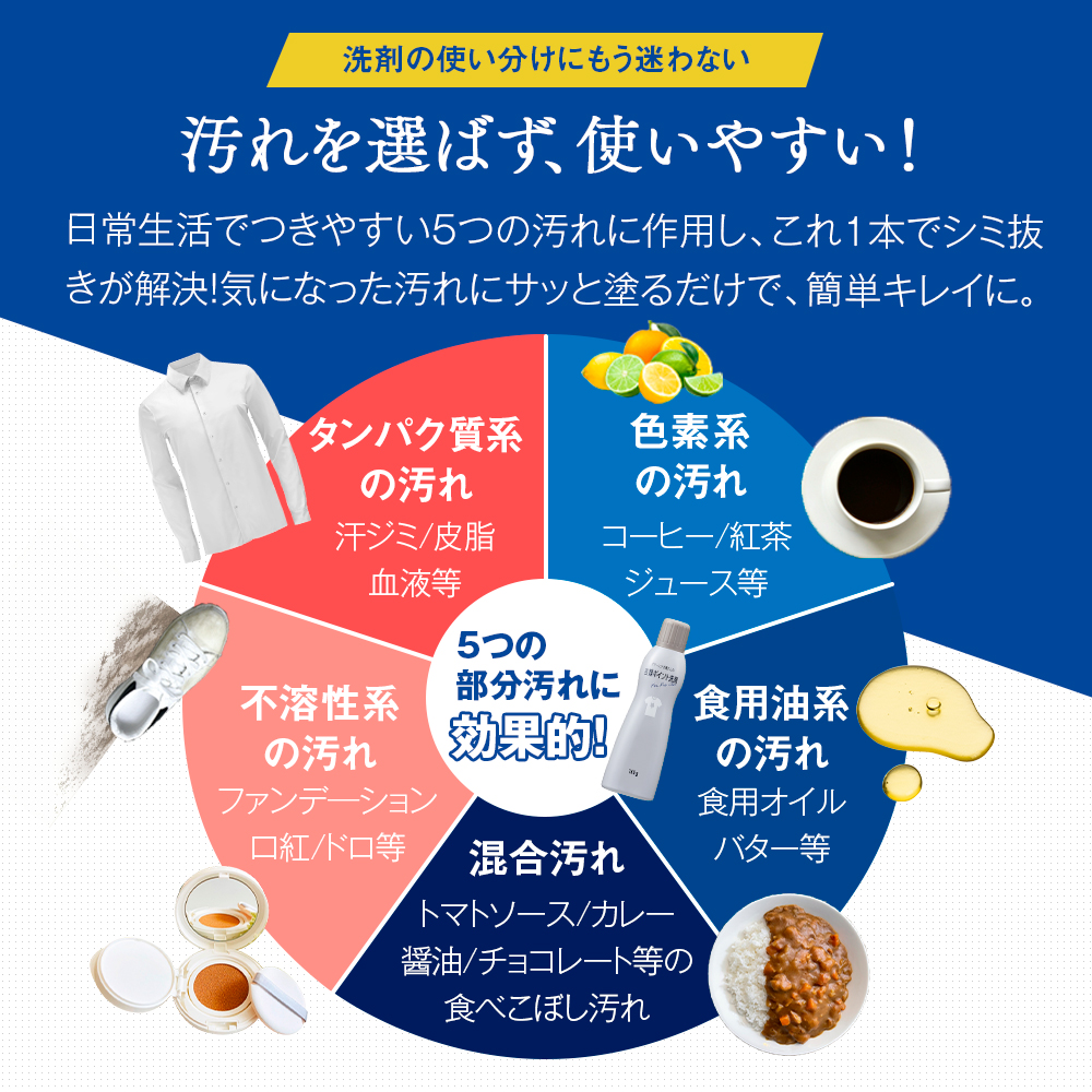 クリーニング屋さんも使っている業務用のポイント洗剤。汗ジミ、皮脂、ファンデーション汚れ、ドロ、食べこぼし汚れなどの5つの部分汚れに対応しているので、汚れを選ばず使いやすい!幅広の塗口でサッとひと塗りすれば、濃密な液が汚れの奥まで浸透。洗濯前に塗布して洗濯機へ入れるだけで、おしゃれ着についた汚れも落とします。