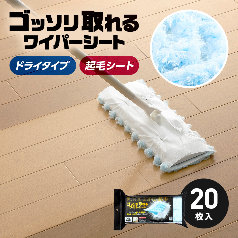 ワイパーシート ドライタイプ 20枚入 ドライシート 使い捨て 立体吸着 起毛シート ゴッソリ取れる フローリングワイパー 髪の毛 ホコリ ペットの毛 花粉