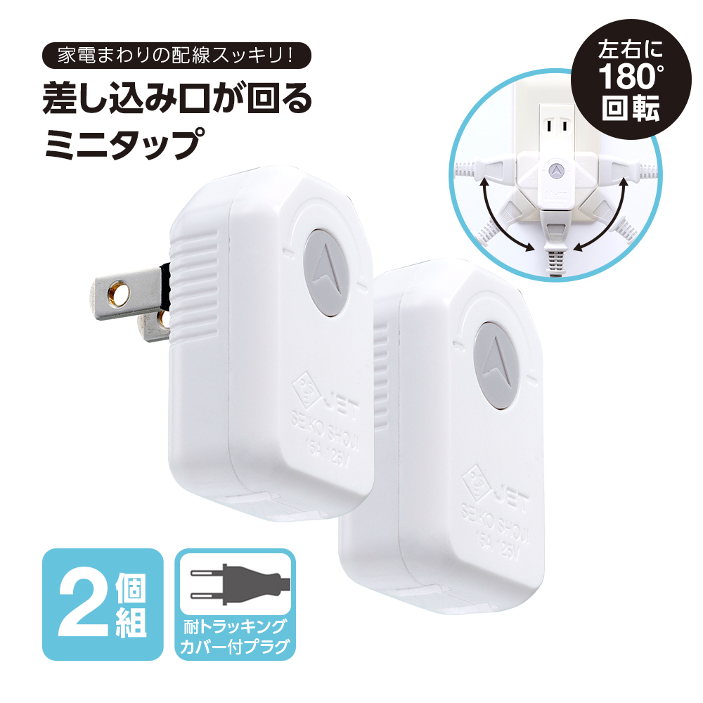 コンセントプラグ 180°回転 差し込み口が回る ミニタップ 2個組 ホワイト 電源タップ コンセントタップ 1個口 コーナータップ コンパクト すき間 省スペース