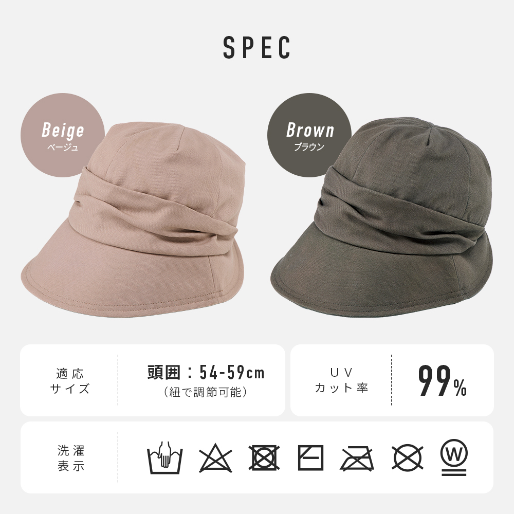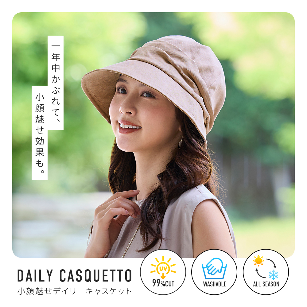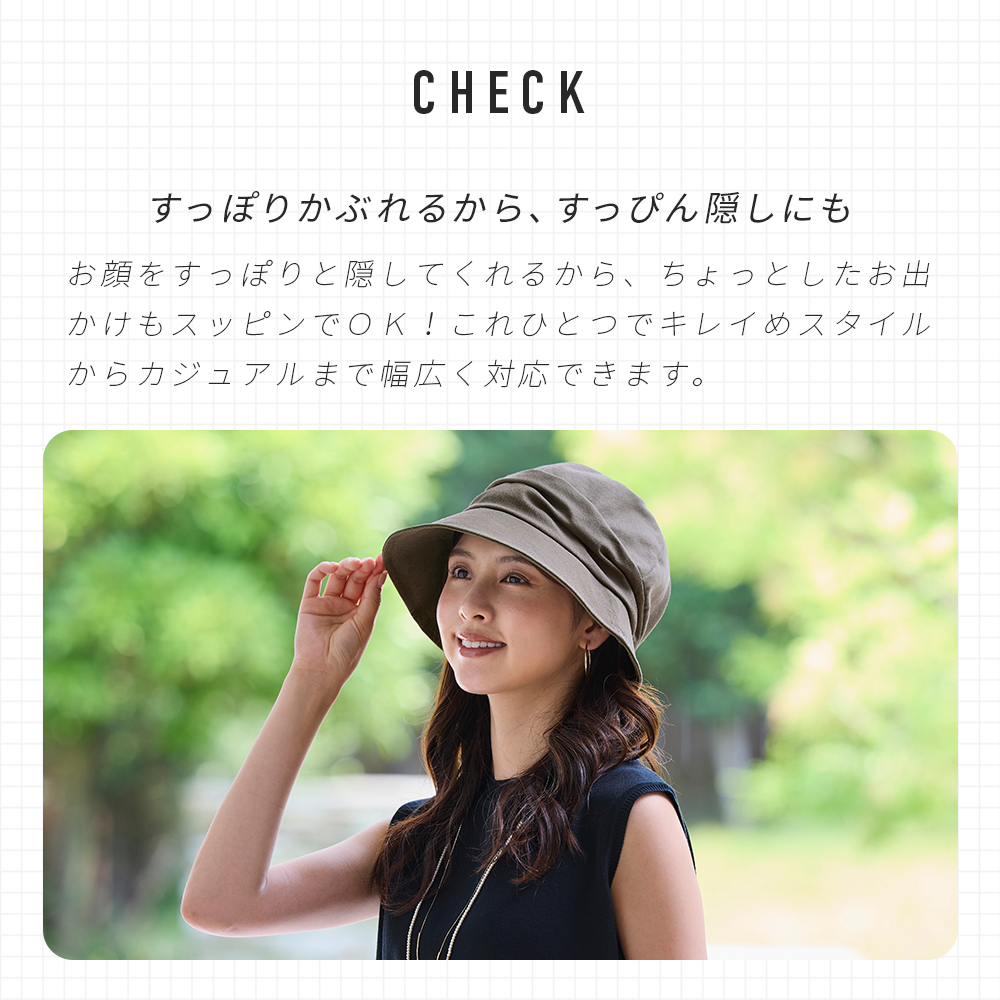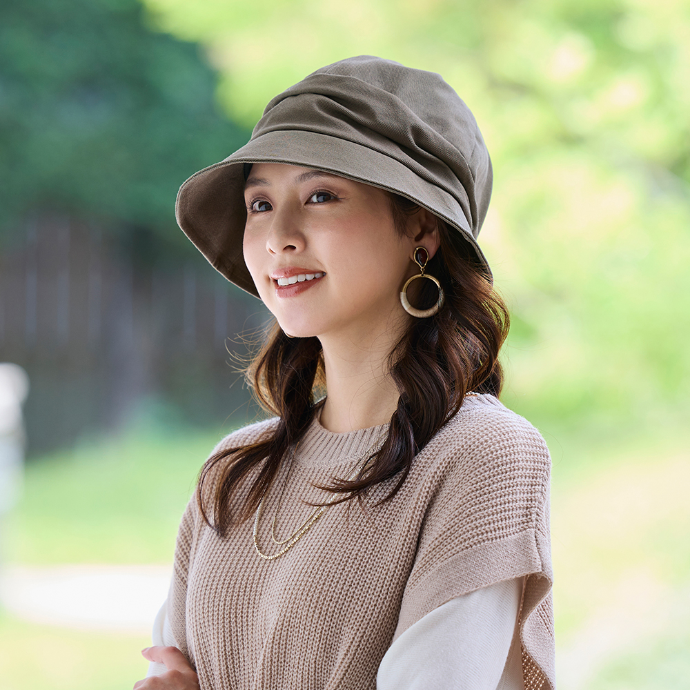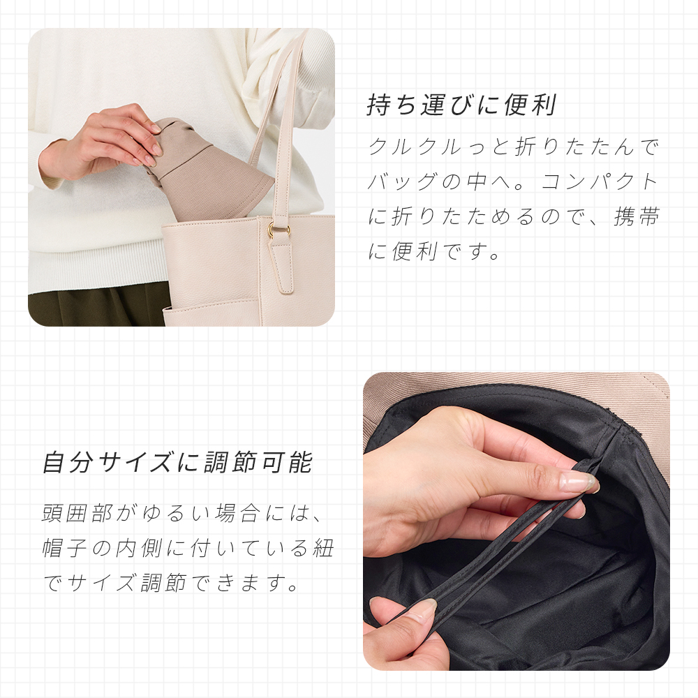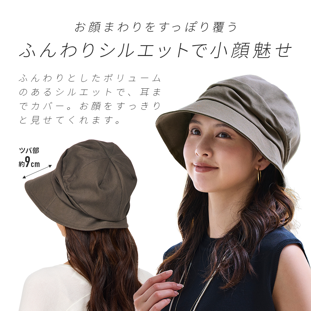 ふんわりシルエットで小顔魅せ。すっぽりかぶれるおしゃれな帽子。シーズンを問わず着用できる素材で、きれいめからカジュアルまで幅広く対応。耳までカバーできるのであたたかく、すっぴん隠しにも便利。折りたたんでコンパクトに収納OK!頭囲部がゆるい場合はヒモで調節可能。UVカット率99%以上。手洗いOK。