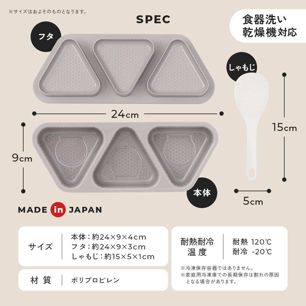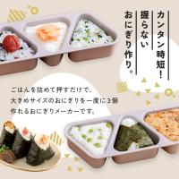 カンタン時短!握らないおにぎり作り。同じ大きさのおにぎりが一度に3個作れます。おにぎりは大きめの8cmサイズ。ミニサイズの専用しゃもじ付きでご飯が入れやすく、押し出しスリット付きで取り出しがスムーズ。しゃもじはフタにピッタリ収納可能。食洗機対応、日本製。