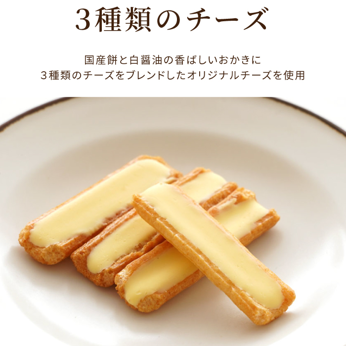 | 原材料 | 餅米(国産)、植物油脂、チーズ(チーズ、脱脂粉乳、乳蛋白、乳糖)、白醤油(小麦を含む)、澱粉、砂糖、食塩、乳化剤、調味料(アミノ酸等)、香料、レシチン、着色料(カロチン) |