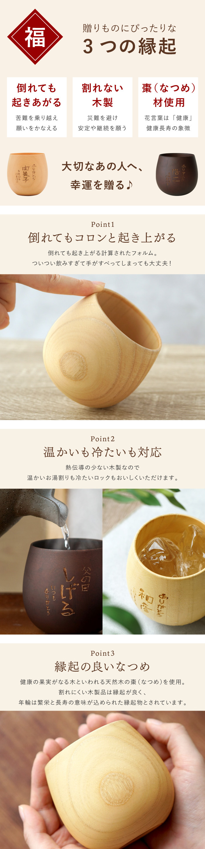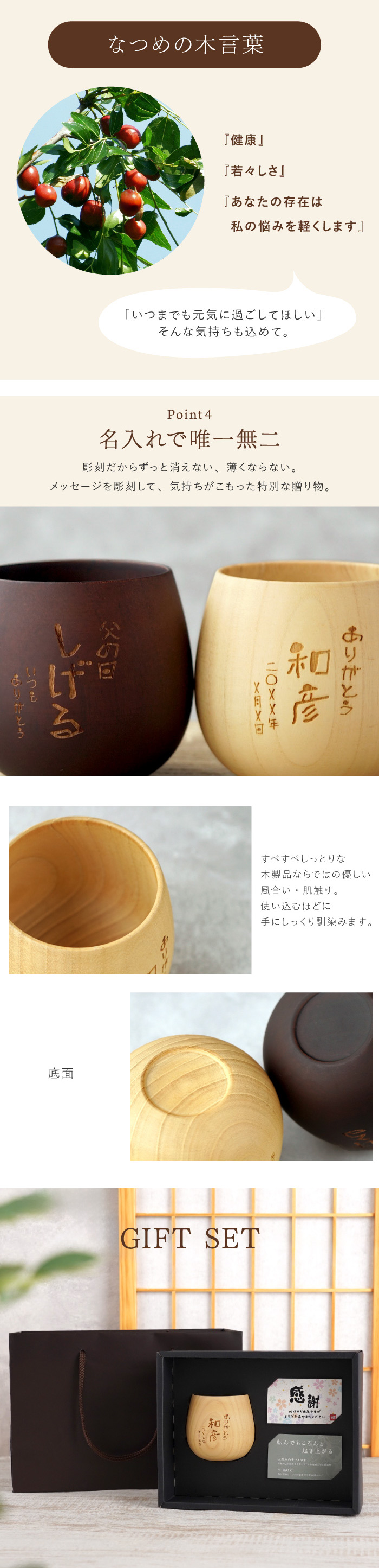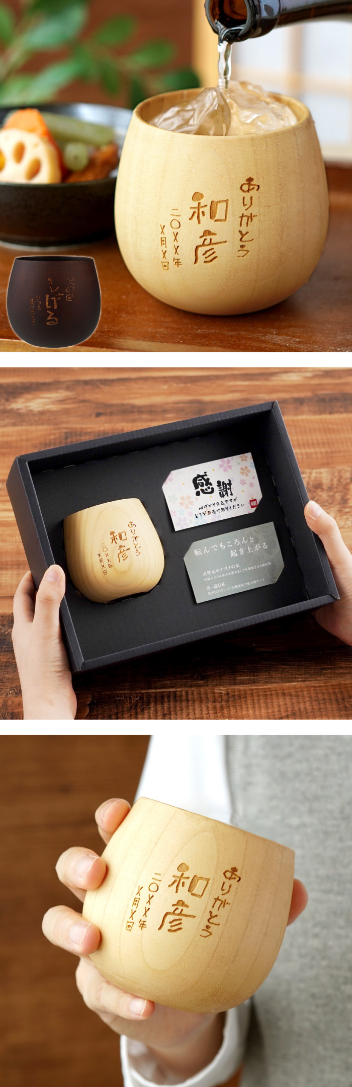 | 【 名入れOK! 木製 焼酎グラス 】 ■「お父さん、いつもありがとう」の気持ちを込めた焼酎グラス。 なつめの花言葉は「健康」、「若々しさ」、「あなたの存在は私の悩みを軽くします」・・・ いつまでも健康で若々しく過ごしてほしい。そんな想いもグラスに込めて。 ロックでもお湯割りでも使い勝手抜群! 熱が伝わりにくい木製だから、冷たいものを入れても結露しにくく、温かい飲み物を入れても手が熱くなりません すべすべしっとりな木製品ならではの優しい 風合い・肌触りで、使い込むほどに手にしっくり馴染みます 届いてそのままプレゼントできる専用ギフトボックス入りで贈り物にも安心♪ ■オリジナルで特別なギフト、プレゼントに! 木製 焼酎グラスはお父さん、おじいちゃんに、 父の日や敬老の日の贈り物に! 旦那様へ記念日、誕生日のプレゼントにも◎ 長寿祝い、米寿、傘寿、喜寿、還暦祝いのギフトにもおススメです♪ お世話になった先生や先輩へ 卒業や退職など送別のプレゼントにも。 名入れで世界にひとつのプレゼント! | |