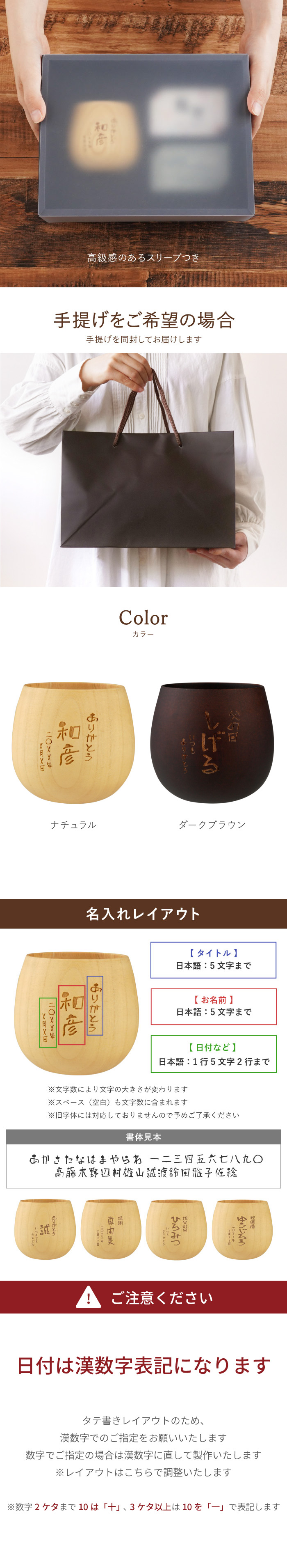 | 彫刻内容 | ■文字数:すべて日本語のみ ●タイトル:日本語5文字まで ●お名前:日本語5文字まで ●日付など:日本語:1行5文字2行まで |