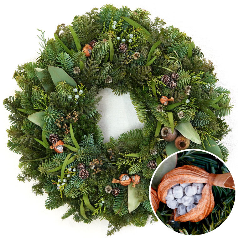 | 仕様 / サイズ | ■種類:フレッシュリース(生) ※自然素材を中心にひとつひとつ手作業で製作しております ひとつとして同じものは存在しない、個性をお楽しみください。 ■使用素材:オレゴンモミ、ポポラスベリー(プチプチがついたユーカリ)、ユーカリニッコリ(←カワイイ名前です)、ひむろ杉、ジュニパーベリー、ミニツガ、スレンギア、ガンベルズ ■サイズ:直径約30cm ■重量:約750g ■メッセージカード:ご希望の方は「備考欄」にご記載くださいませ フォト花電報の写真の送り方については⇒こちら |
