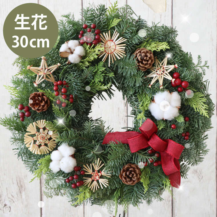 | 仕様 / サイズ | ■種類:フレッシュリース(生) ※自然素材を中心にひとつひとつ手作業で製作しております ひとつとして同じものは存在しない、個性をお楽しみください。 ■使用素材:オレゴンモミ、ヒバ、サンキライ、松ぼっくり、コットン、ヒンメリオーナメント等(デザインは変わる場合がございます) ■サイズ :直径約45cm、重さ約1200g ■セット内容:クリスマスリース本体、説明書 ■メッセージカード:ご希望の方は「備考欄」にご記載くださいませ フォト花電報の写真の送り方については⇒こちら ※花材、オーナメントは、仕入れの状況によりイメージの近いものに予告なく変更される場合がございます。あらかじめご了承くださいませ。 |