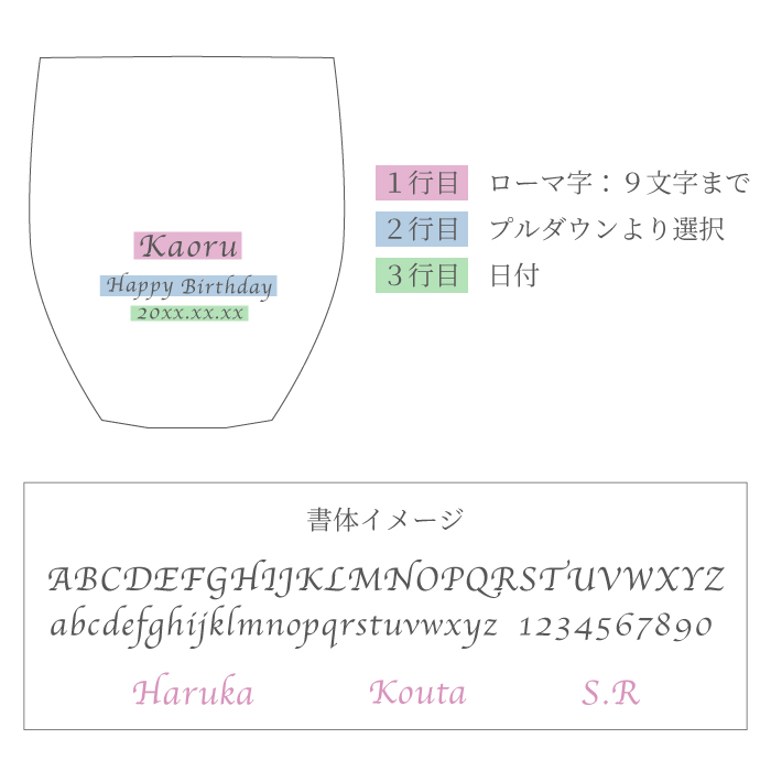 | 彫刻内容 | 1行目:ローマ字9文字まで 2行目:プルダウンより選択 3行目:日付 |