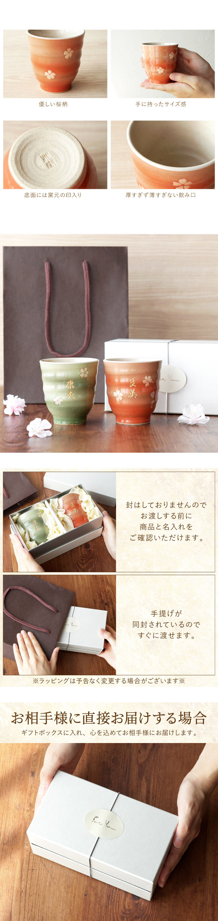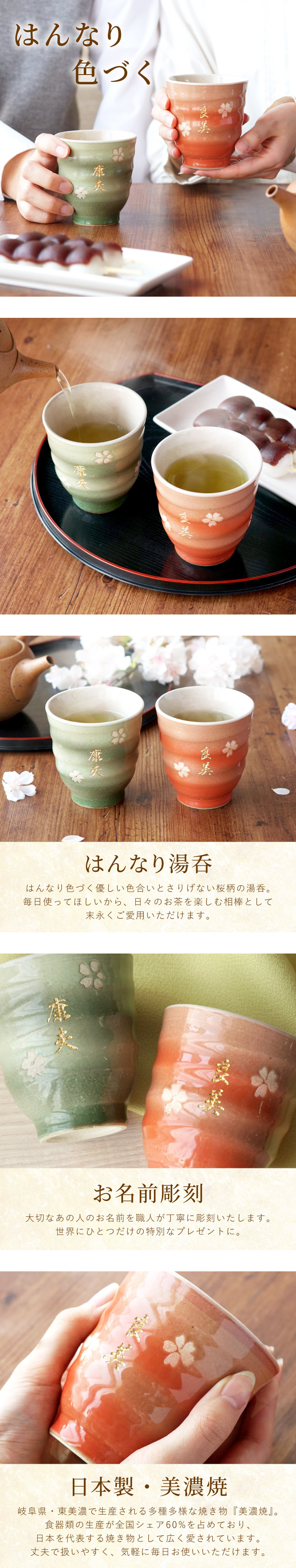 | 【名入れOK! 美濃焼 はんなり湯呑み 夫婦 セット 】 ■優しい色合いと桜の柄が印象的な日本製 美濃焼 はんなり湯呑み 日常使いにピッタリなサイズだから 食後のお茶に、3時のお茶タイムに、日々のお茶を楽しむ相棒として 末永く愛用していただけます はんなりとした時間を名入れの湯呑みとともにお楽しみください 【美濃焼】 岐阜県南東部、岐阜県多治見市、土岐市を中心に産する陶磁器 桃山期には、志野・織部・黄瀬戸などのすぐれたものが作られました 現在ではバラエティに富んだやきものを生産し、 食器生産量は全国一の、やきもの産地といえます ■名入れで、オリジナルの特別なプレゼントに。 優しいあの人へ贈りたい、美濃焼 はんなり湯呑み 単品は お父さん、お母さんへ感謝の気持ちを込めて、 父の日・母の日のプレゼントにぴったり! ふわっとした色合いに桜柄が、日本らしいので、 外国の方へのお土産にも喜ばれます。 もちろん、おじいちゃん、おばあちゃんへの敬老の日の贈り物や 米寿、傘寿、喜寿、還暦のお祝いにも◎ 名入れプレゼントで世界に一つの贈り物! | |