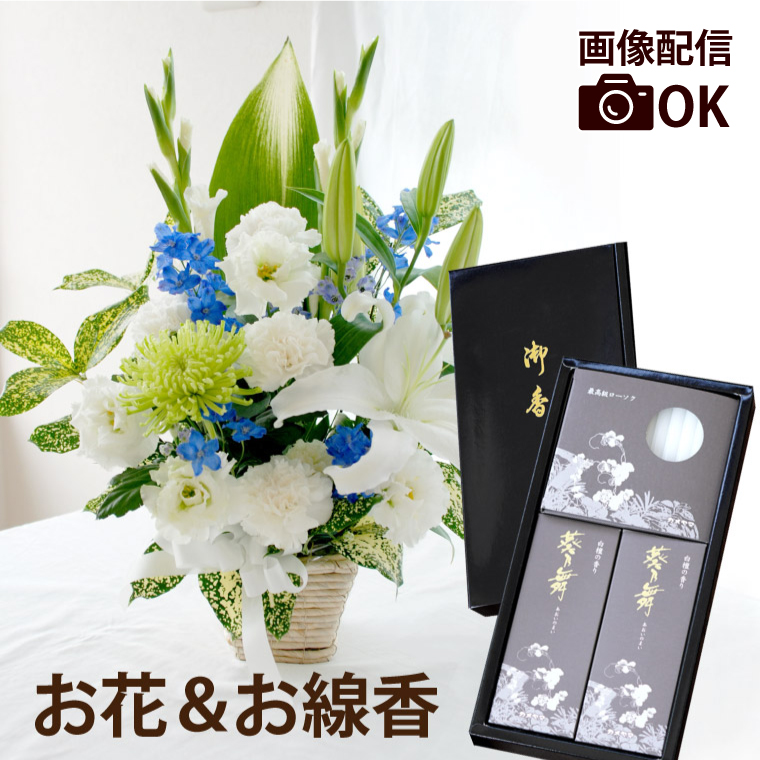 | 仕様 / サイズ | 【お供え花】 ■素材:生花 ※時期や仕入れ状況により、雰囲気が変わらない程度に花材が変更となる場合がございます。 ※アレンジメントの器は変更になる場合がございます。 ■サイズ アレンジ:縦約40cm、横約30cm 【お線香】 葵乃舞(約3g)×2箱 燃焼時間:約30分 【大ローソク】 1号5×18本 燃焼時間:約1時間 ■メッセージカード:ご希望の方は「備考欄」にご記載くださいませ ※ソーシャルギフトご注意点※ 熨斗の名入れと名札(立て札)の対応はできかねます |