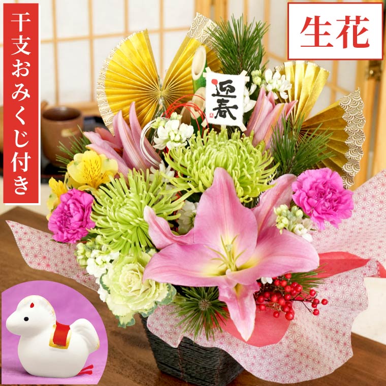 | 仕様 / サイズ | ■種類:生花 アレンジ ※時期や仕入れ状況により、雰囲気が変わらない程度に花材が変更となる場合がございます。 ※アレンジメントの器は指定いただけません ■サイズ 縦約50cm×横約40cm×奥行約30cm ※個体差があります ■セット内容:迎春門松風アレンジ、説明書、栄養剤、干支おみくじ ■メッセージカード:ご希望の方は「備考欄」にご記載くださいませ フォト花電報の写真の送り方については⇒こちら |