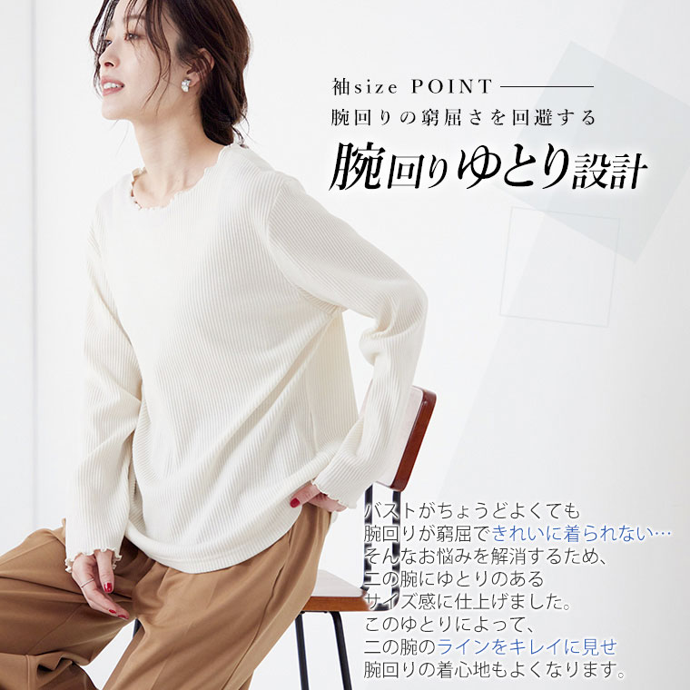 ■着用感:ちょうどいい、■着丈:ヒップ半分、■バスト:ちょうどいい、■腕回り:ちょうどいい、■袖口:ちょうどいい、■袖丈:長袖、■首回り:ややゆったり、■ウエスト:-、■ヒップ:-、■太もも:- ●ストレッチの効いている柔らか素材で着心地がよく、リブが縦ライン強調してすっきり見えます。