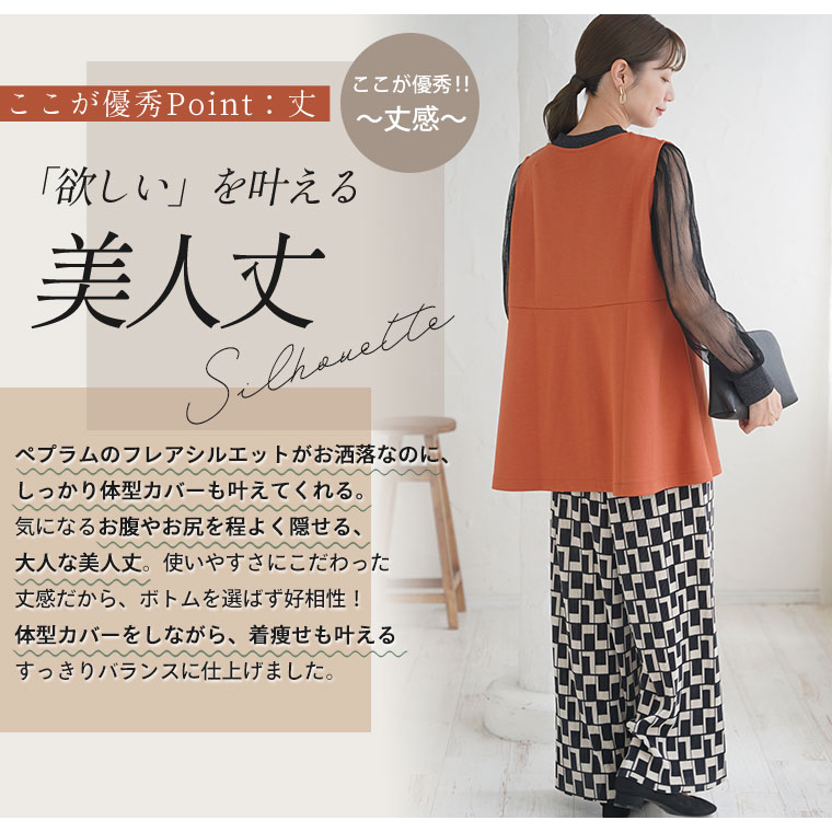 ■着用感:ちょうどいい、■着丈:お尻すっぽり、■バスト:ちょうどいい、■腕回り:ちょうどいい、■袖口:ちょうどいい、■袖丈:-、首回りちょうどいい、■ウエスト:-、■ヒップ:-、■太もも:- ●ストンと着られて楽ちんです。くびれ見えする形で、お尻も隠せて大人女性にオススメです。