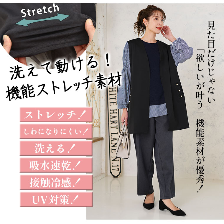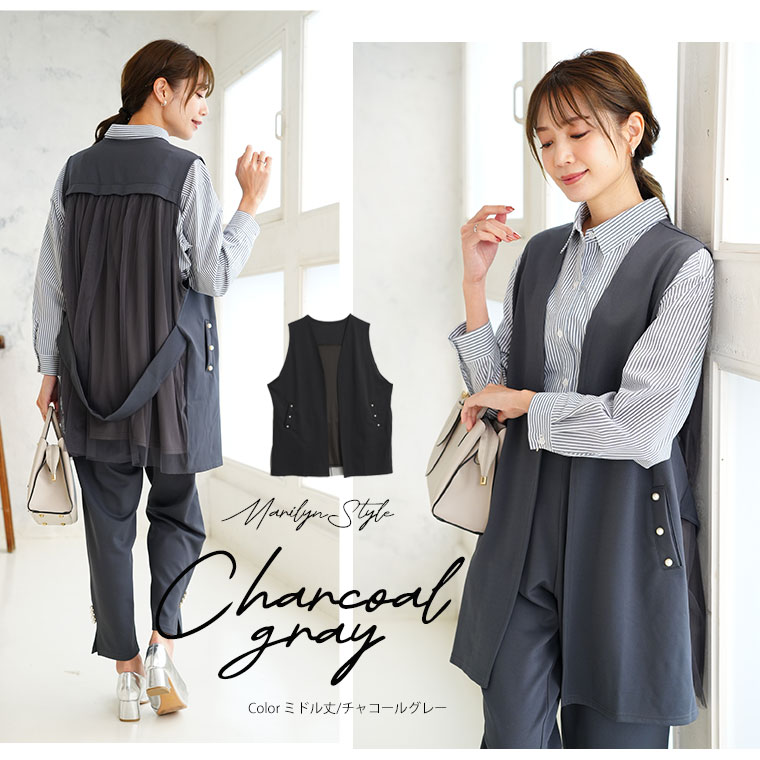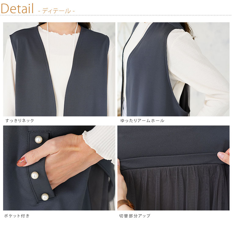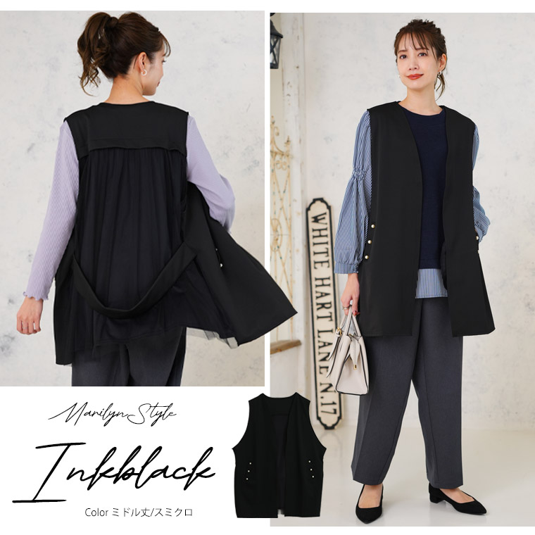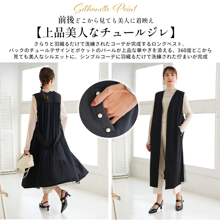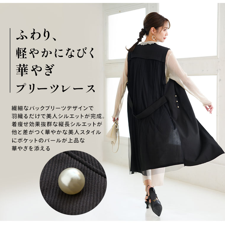 ひらっと軽やかなバックチュールで華やかさ、ポケットのパールで上品さもプラスした大人ジレ