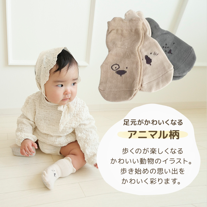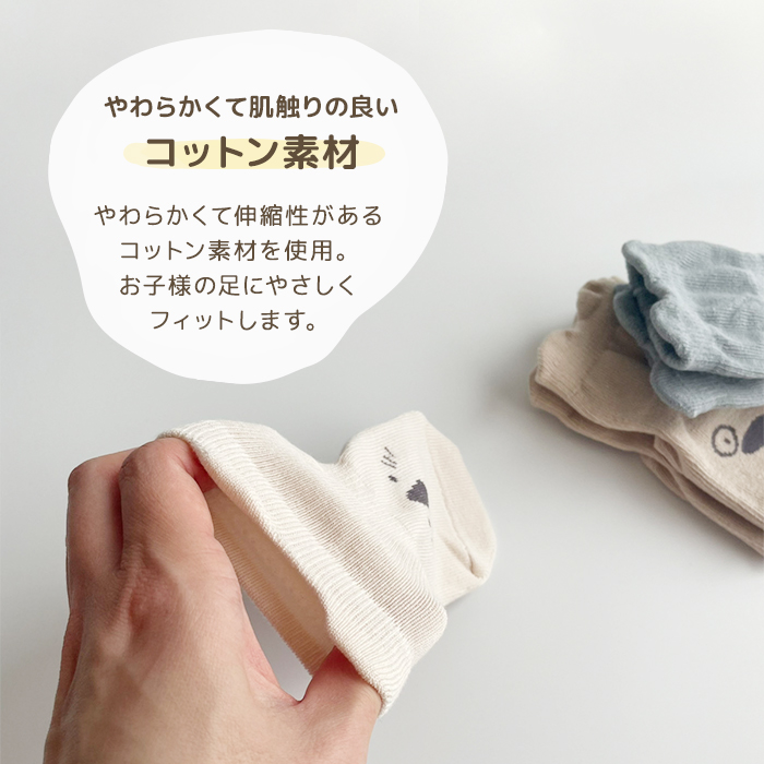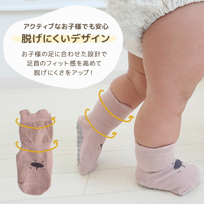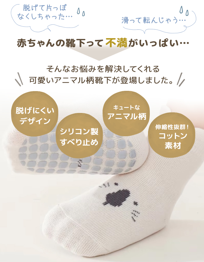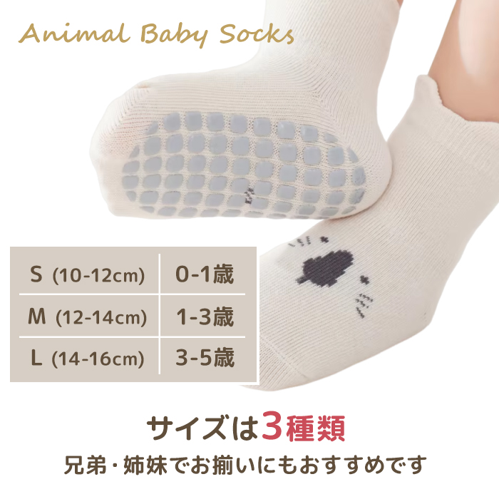 | *脱げにくいベビーソックス【3足セット】です。 *「片っぽなくしちゃった…」「滑って転んじゃう…」などのベビーソックスによくあるお悩みに寄り添い作られました。 *足首のフィット感を高めているので、脱げにくさがアップしています。 *裏面にびっしり付いたシリコン製の滑り止めで、転倒防止!よちよちあんよもしっかりサポートしてくれます。 *アニマルのお顔がとってもかわいいデザイン。ついつい見せびらかしたくなる可愛さです。 *履き口にはお耳付きでキュートさがよりアップ! *やわらかくて、肌ざわりの良いコットン素材。 * サイズはSMLの3種類。10-16cmまでご用意致しました。 *兄弟・姉妹でお揃いもおすすめです。 *普段用、保育園、お出かけ用におすすめです。 ※ご注意! *同じカラー、サイズでも生産ロット、時期によって幅や長さが若干異なる場合がございますのでご了承ください。 *モニターにより実際の色味と若干ことなる場合がございます。予めご了承ください。 *洗濯後、少し縮む場合がございます。 | ||||||||