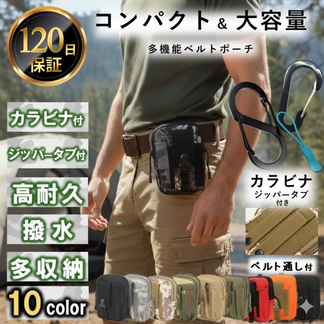 ベルトポーチ ウエストポーチ カラビナ ジッパータブ付 ヒップバッグ タクティカルポーチ ベルト通し 大容量 スマホ メンズ レディース アウトドア 作業