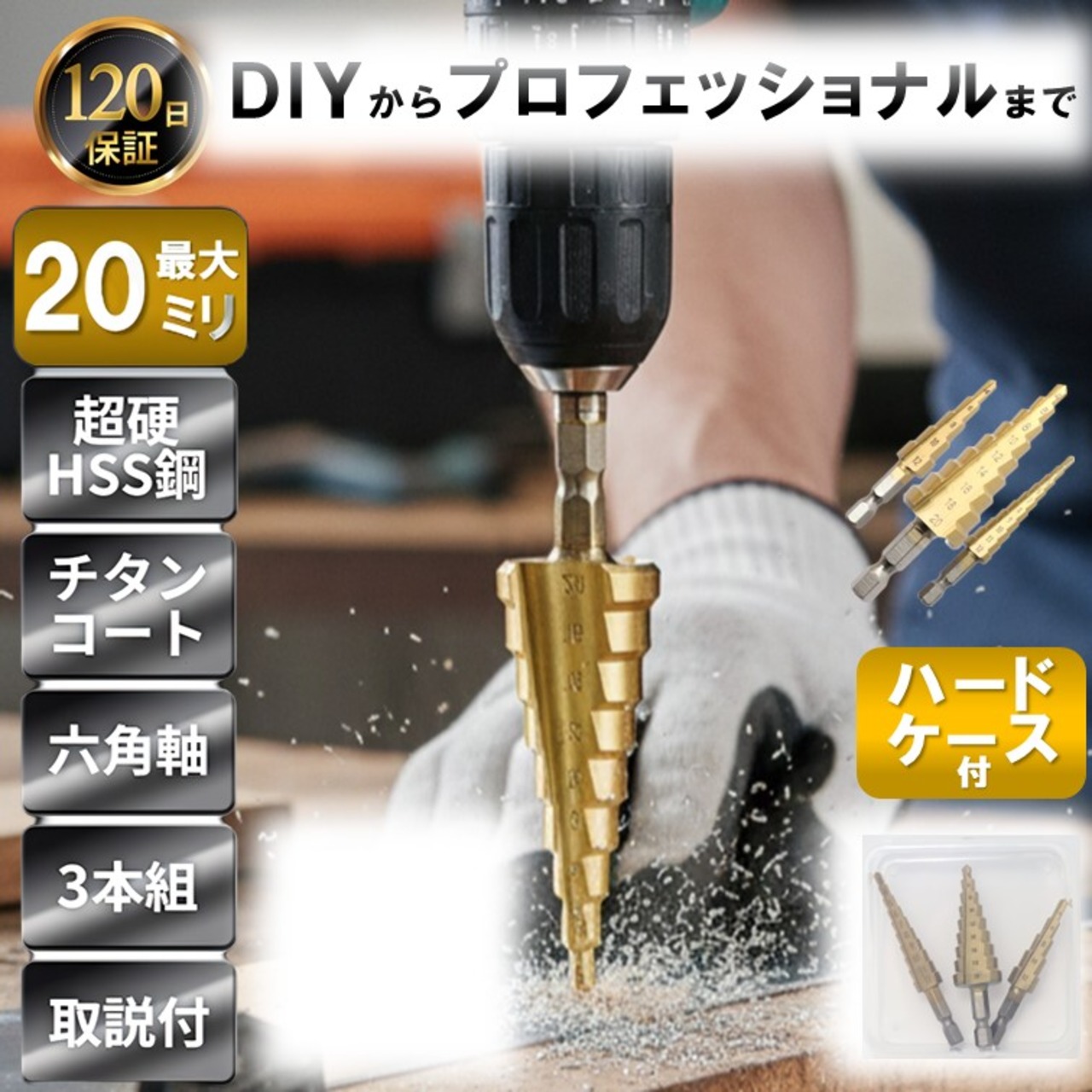 ステップドリル セット 最大 20ミリ 3本 ハードケース 付 スパイラルドリル 穴あけ タケノコドリル チタンコーティング 六角軸 HSS DIY ドリル刃 20mm