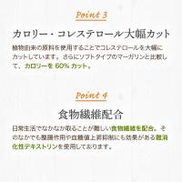 特徴:植物由来の原料をベースに作ったヴィーガン対応、特定28品目のアレルギー原料不使用のマーガリン様食品です。ソフトタイプのマーガリンと比較してカロリーを60%カットしています。