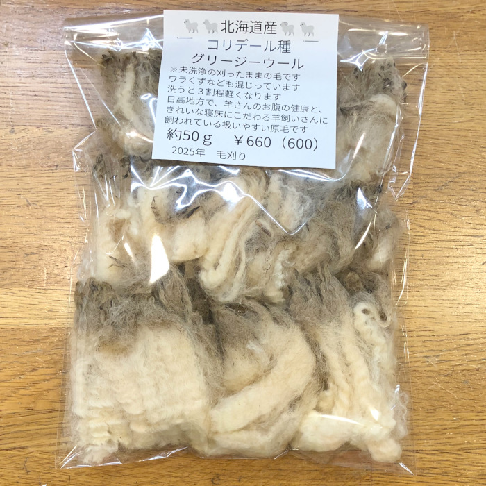 メール便可 北海道産羊毛 コリデール種グリージーウール(未洗浄)50g