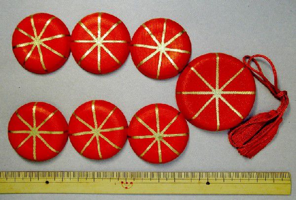 日本舞踊『京鹿子娘道成寺、花笠踊(七枚笠)』の小道具です。手に持つ三連の笠は針金でつながっています。