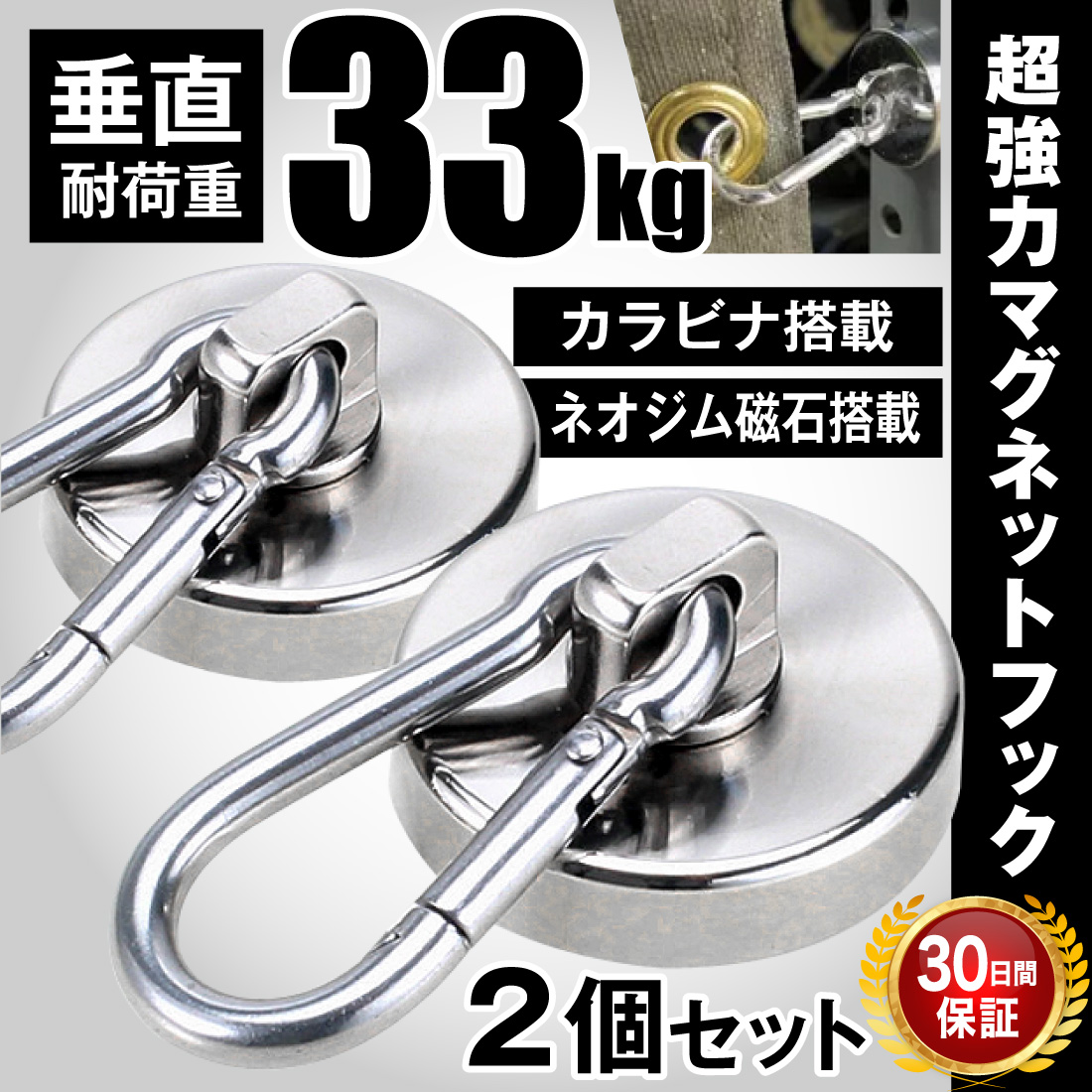 マグネット フック 強力 磁石 カラビナ 2個セット 垂直 耐荷重 33kg キッチン 冷蔵庫 倉庫 屋外 取り外し 可能 収納