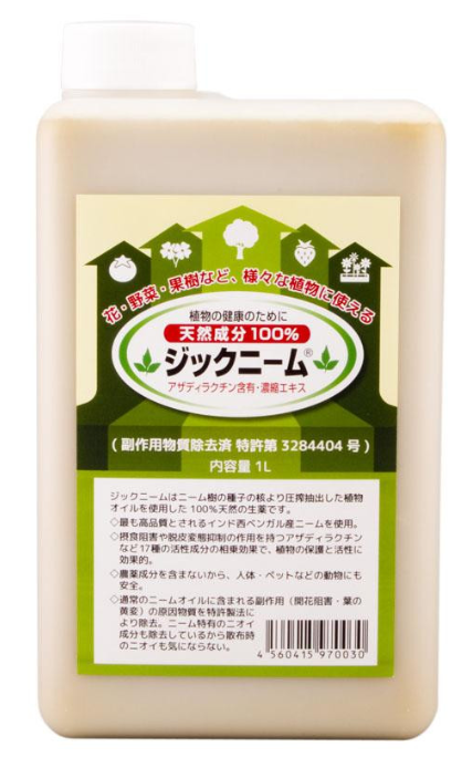 ニームオイル(ジックニーム原液・・・アザディラクチン・サラニン・メリアントリオール・ニンビン・ニンビディン・ニンビオール・ゲデュニン・ニンビネートナトリウム・ケルセチン・など)、ムクロジ乳剤(天然乳化剤)、水