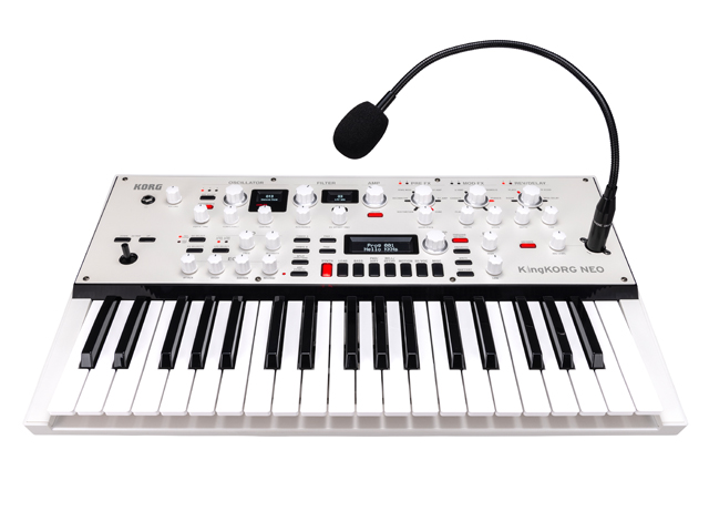 さらに、マイク入力の代わりにティンバーB をモジュレーターとして使うこともでき、シンセ音に対してボコーダー効果をエフェクトとして組み合わせることもできます。KingKORG NEO には金属製の専用グースネック・マイクが付属しており、パネル右側の XLR 端子に差し込むと、すぐにあのおなじみのサウンドが高音質で楽しめます。