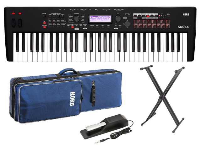 KORG KROSS 2 61鍵盤モデル Super Matte Black、ソフトケース「SC-KROSS2-61」、ダンパーペダル「DS-1H」、X型キーボードスタンドのセットです。