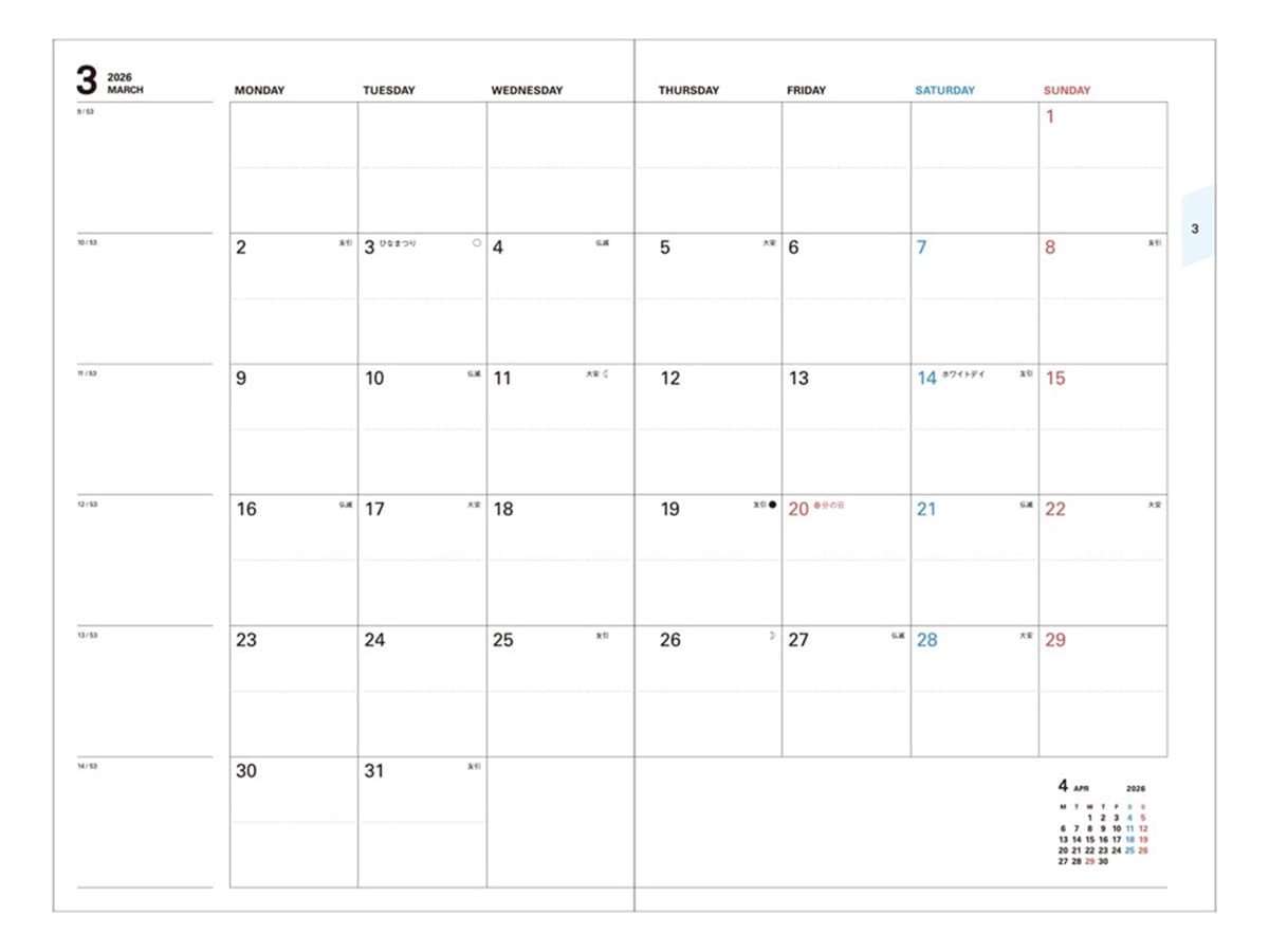 | レイアウト | 3月始まり/月曜始まり |