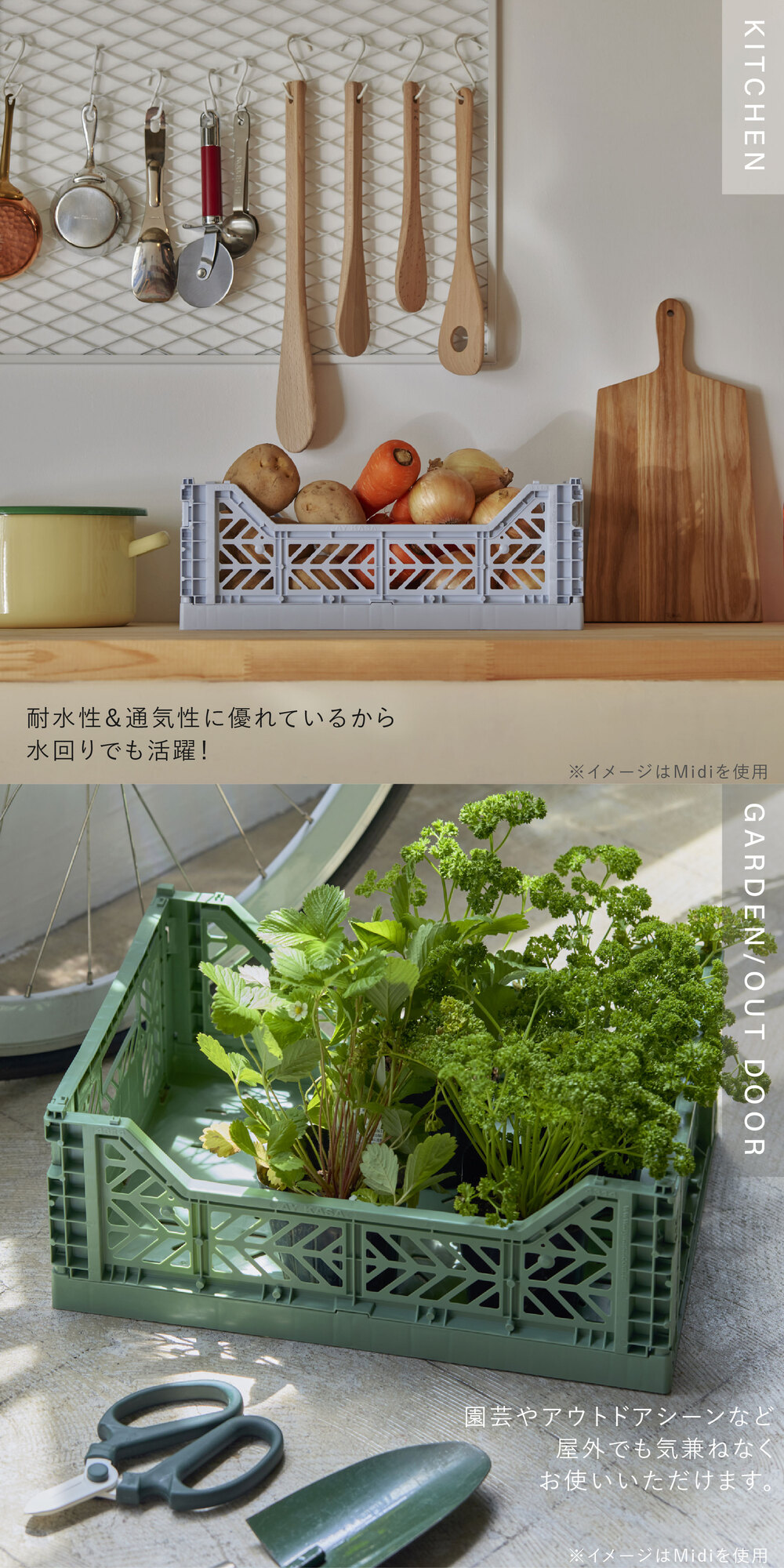 水洗いできるポリプロピレン製。風通しもよく、食品ストックやバスルームの収納としても活用できます。