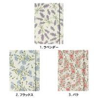 ラベンダー、フラックス、バラがちりばめられ、爽やかな色合いがおしゃれなデザイン。表紙のゴムバンドは開きがちな手帳を押さえ、持ち運びにも便利なA5サイズのバインダーです。デスクに置いてもかわいく、中のリフィルも傷つきにくいハードカバー仕様。日記や、プランナー、ライフログなどのカバーにおすすめです。