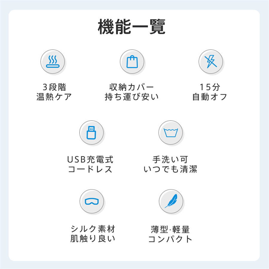 ★検索キーワード:目元エステ 目元 目もと 温熱 美容器 マスク USB充電式 男女兼用 アイ 遮光 自動オフ 3段階温熱 遮光 睡眠 休憩 グッズ 軽量 通気性 旅行 長さ調節 オールシーズン プレゼント 繰り返し使える