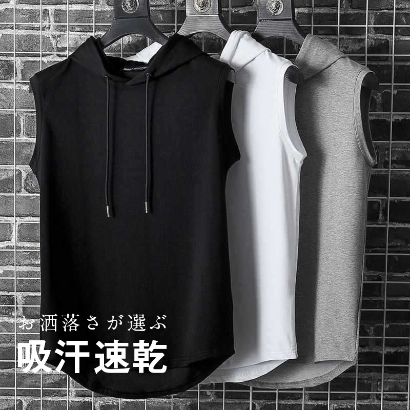 タンクトップ 夏パーカー メンズ インナー Tシャツ フード付き ノースリーブ 夏 トップス 重ね着 薄手 無地 スポーツ お兄系 送料無料 爆買