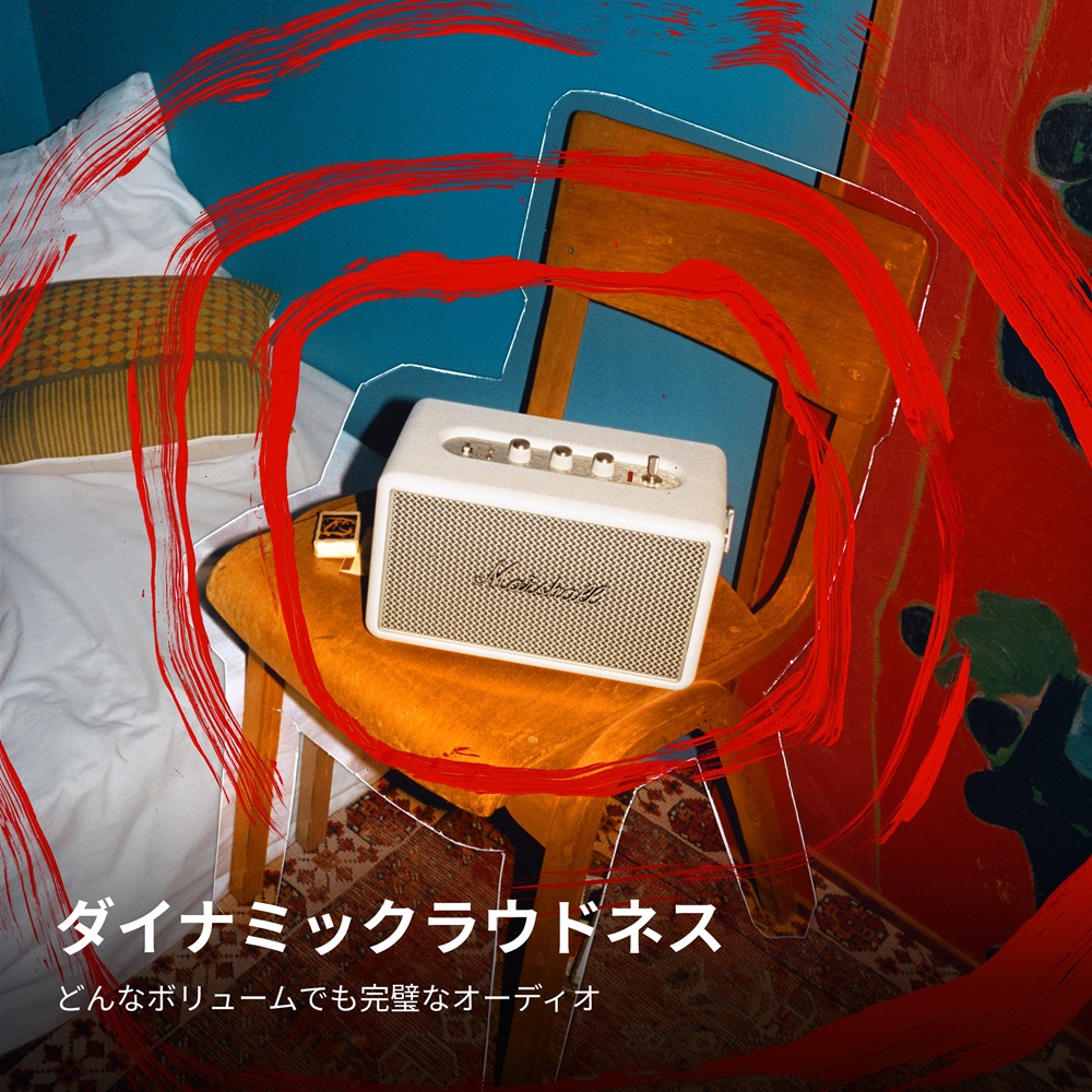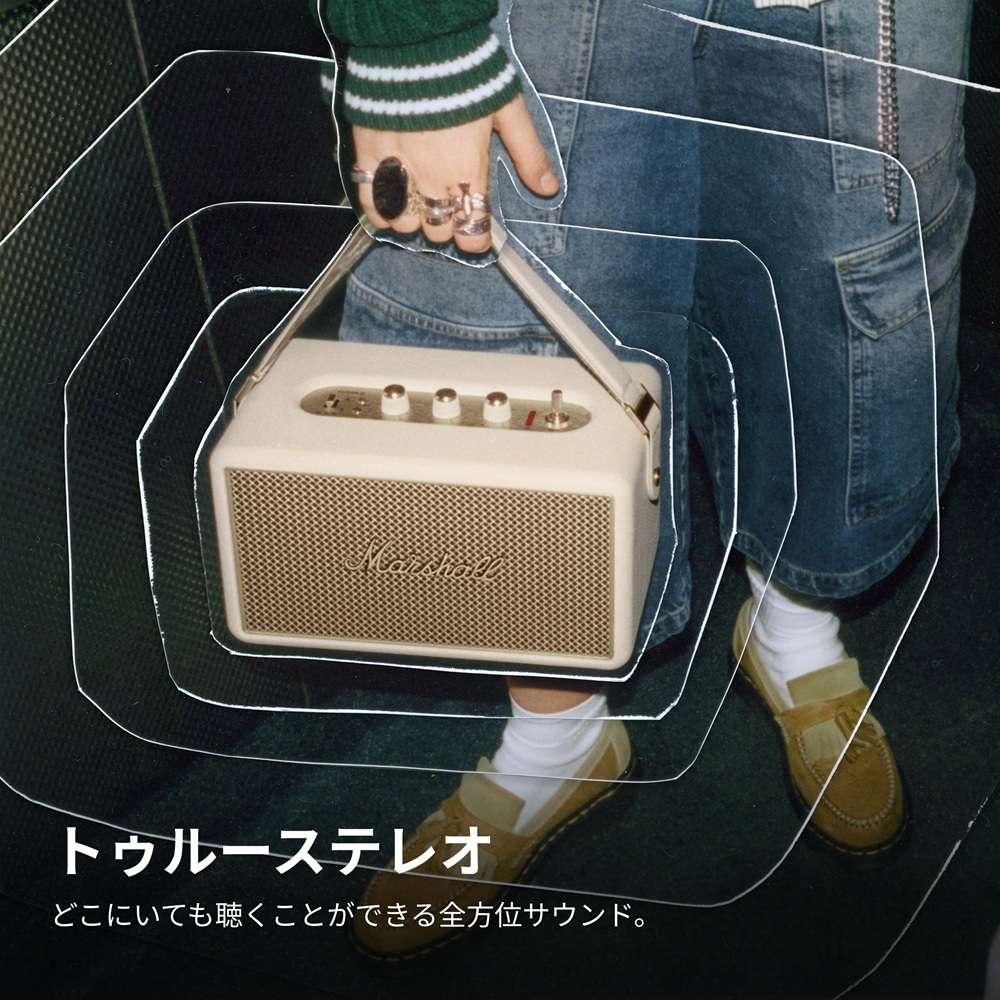 立体的なサウンド体験を実現するMarshall独自のマルチディレクショナル(全方位)サウンドを採用Marshall独自のマルチディレクショナル(全方位)サウンド設計により、部屋のどこにいても均一な音量と音質で音楽をお楽しみいただけます。改良されたチューニングと広帯域のスピーカードライバーにより、丸みのある中音域、クリアな高音域、そして深みのある低音域を実現。あらゆる空間で、Marshallならではの立体的なサウンド体験を提供します。