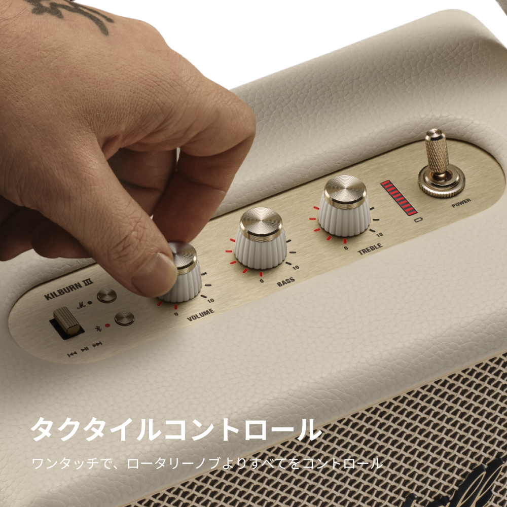 ワンタッチで、ロータリーノブよりすべてをコントロール低音や高音の調整、オン/オフの設定、曲の再生/停止/スキップはすべてワンアクションでコントロールロータリーノブより可能です。Marshallの「M」ボタンを使って、即座にプリセット状態へもアクセス可能です。
