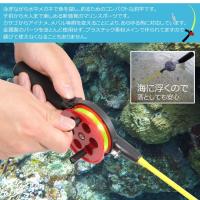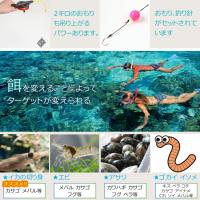 泳ぎながら水中メガネで魚を探し、釣るためのコンパクトな釣竿です。子供から大人まで楽しめる新感覚のマリンスポーツです。カサゴからアイナメ、メバル等餌を変えることにより、あらゆる魚に対応しています。金属製のパーツをほとんど使用せず、プラスチック素材メインで作られてますので錆びて使えなくなることもありません。【サイズ】全長約42cmシャフト素材 特殊ポリエステル樹脂耐荷重 2kgまでなら持ち上がります。釣り糸(約10M)、釣り針、おもりがセットされています。フローティングタイプ (水面に浮きます)※スノーケリングで使用する場合は、必ずライフジャケットを着用してください。※1 使用後は しっかりと真水ですすいでください。※2 予告なしに糸、おもり、釣り針の色やサイズなど変更がある場合がございます。予めご了承ください。
