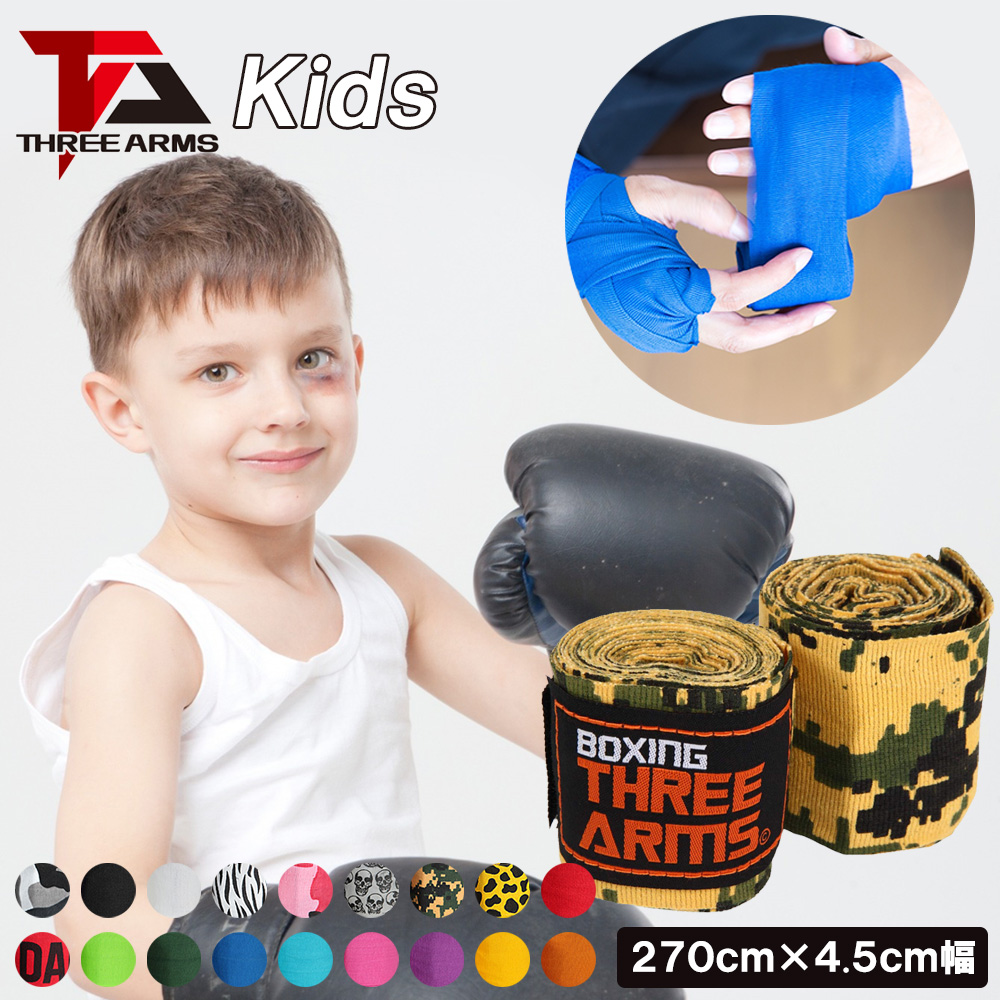 THREE ARMS バンテージ ボクシング キッズ 子供用 伸縮 左右 5.5cm×270cm 子供 ボクサー 格闘技 総合格闘技 高校 テコンドー 空手 キックボクシング サポーター
