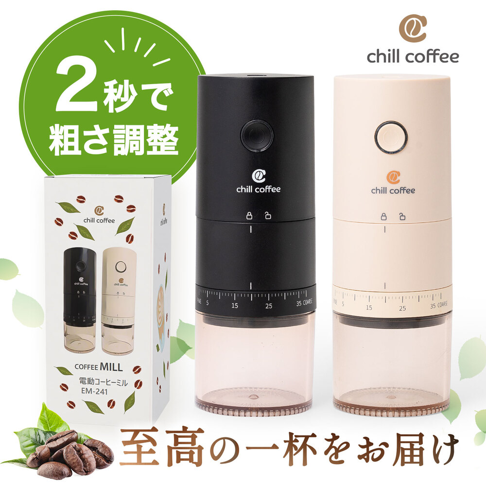 チルコーヒー【2秒で粗さ調整】 EM241 コーヒーミル コニカル式 アウトドア キャンプ 細挽き 1年保証 電動 コーヒーグラインダー ギフト プレゼント