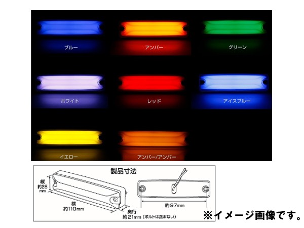 定格電圧範囲:DC24V〜DC36Vサイズ: W 110mm × H 28mm × 奥行 21mm (ボルトは含まない)ネジサイズ: M4 ネジピッチ:97mm 配線(+・−)長さ:240mm 赤線(+)電源 黒線(−)アース材質:本体/ABS:レンズ/PC ボルト/ナット材質: ステンレス内蔵パッキン:シリコンパッキン 付属品:取付ビス2本LED種類:SMD LED数:12個