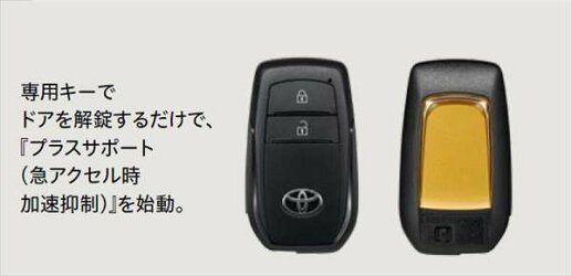 | 詳細 | ※設定:パーキングサポートブレーキ(標準装備・メーカーオプション)付車※ドアを解錠するだけで、プラスサポート(急アクセル時加速抑制)を始動させる専用キー。 障害物の有無にかかわらず、アクセルの踏みすぎや踏み間違いを検知するとクルマの加速を抑制。 警報ブザーとマルチインフォメーションディスプレイ表示でドライバーに注意喚起します。 右左折など加速が必要なシーンでは加速が可能です。 方向指示レバーを操作しないで右左折や車線変更をしたり、ブレーキを踏まない状態から発進するとシステムが作動することがあります。 その場合でも、一度アクセルを離してゆっくり踏みなおすと加速が可能です。 ※色:サテンゴールドサイズ:約L74×W43×H18mm※以下のような時には、プラスサポートにならないことがあります。 ※登録済みの標準スマートキーが車両の近くにある時※通常モードで使用したあと、ドアロックしなかった時※必ずプラスサポート用スマートキーのみが車両の近くおよび車内にある状態でご使用ください。 プラスサポートにならない時はプラスサポート用スマートキーで一度ドアロック後、再度プラスサポート用スマートキーのみを持った状態でアンロックを行ってください。 ※急アクセル時加速抑制機能は自動で停止する機能ではありません。 必ず運転者がブレーキペダルを踏んで停止してください。 ブレーキを制御するシステムではありません。 ※アクセルを速く強く踏み込むような運転をした時に、意図せずシステムが作動することがあります。 ※プラスサポート用スマートキーと標準スマートキーを同時に携帯せず、目的にあった1種類のキーのみを携帯してください。 両方のキーが近くにあると、プラスサポート用スマートキーを判定できず、プラスサポートにならない可能性があります。 また始動時はメーター等でモードの表示を必ずご確認ください。 ※本製品にメカニカルキーは付属していません。 標準スマートキーに付属のメカニカルキーを本製品に差し替えてご使用ください。 ※メカニカルキーが無い状態では、電子キーの電池が切れた時にドアロックを解除できなくなります。 メカニカルキーは追加で購入していただくことも可能です。 お買い上げの販売店にお問い合わせください。 ※自車車速約30km/h以下で作動します。 ※前進および後退時に作動します。 ※植込み型心臓ペースメーカー等の機器をご使用の方は、電波によりそれらの機器に影響を及ぼすおそれがありますので、車両に搭載された発信機から約22cm以内に植込み型心臓ペースメーカー等の機器を近づけないようにしてください。 電波発信を停止することもできますので詳しくは販売店におたずねください。 ※詳しくは販売店におたずねください。 |